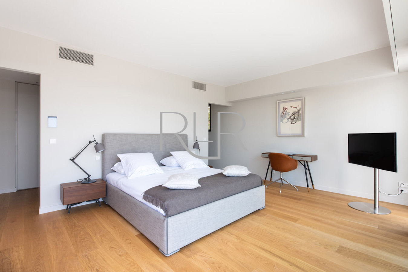 Chambre 1 : Lit double (180 cm), TV, salle d’eau attenante avec double vasque, douche, WC séparé, dressing