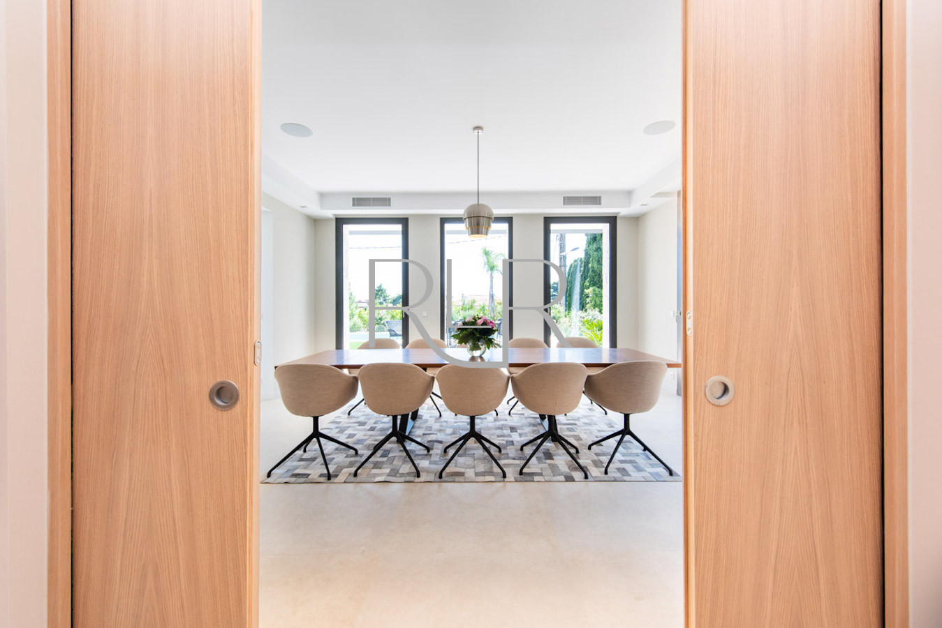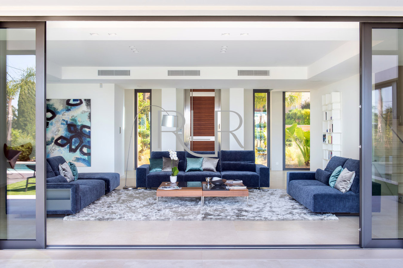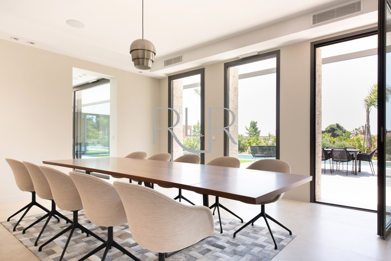 Salon lumineux donnant sur la piscine