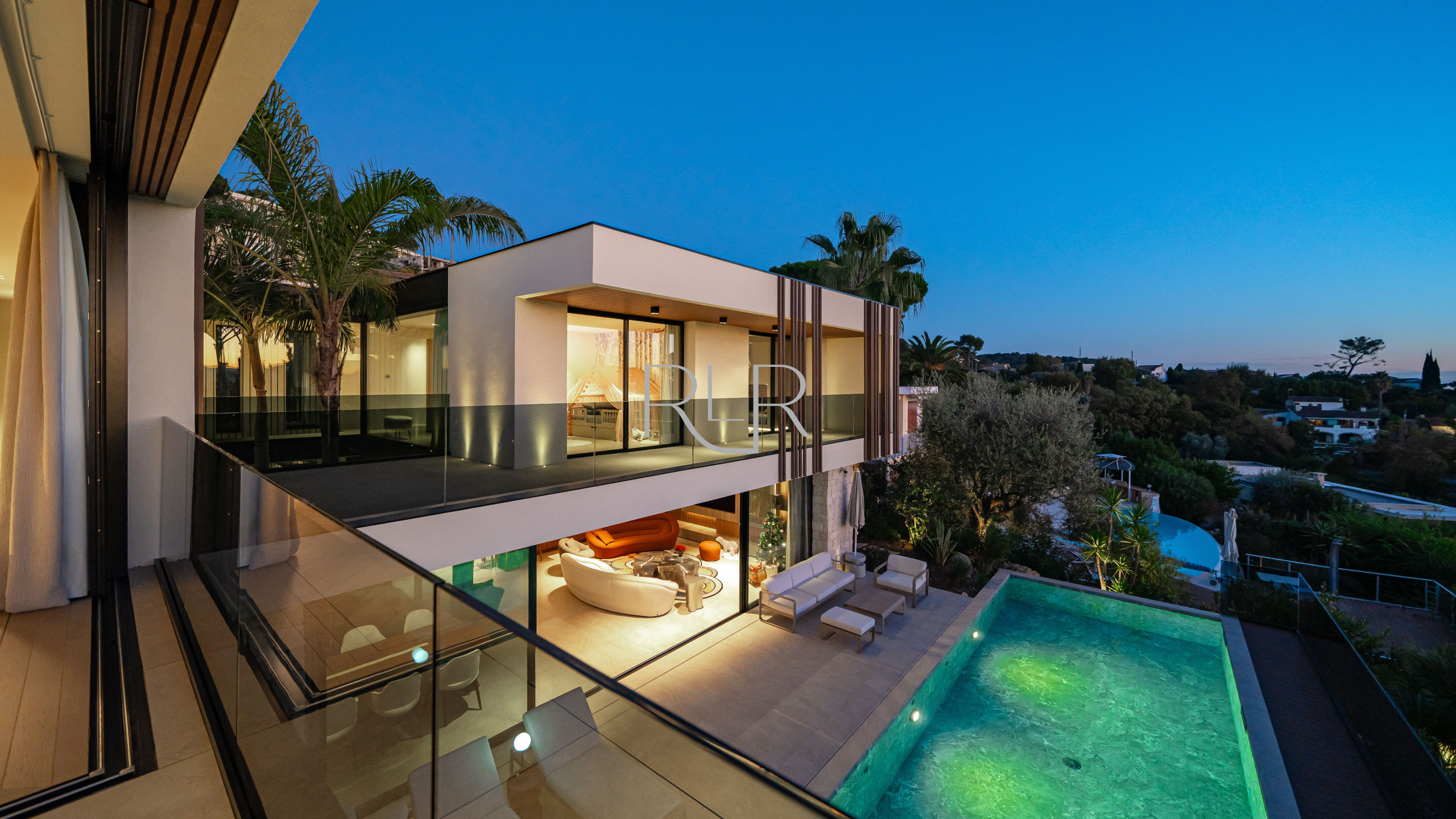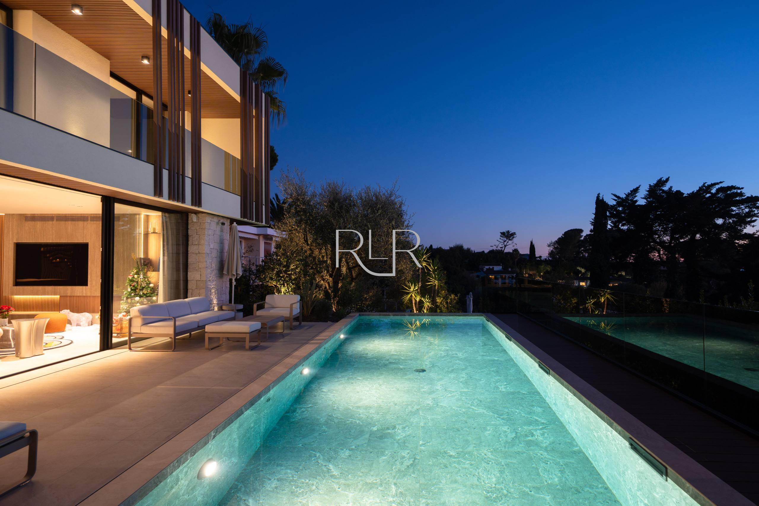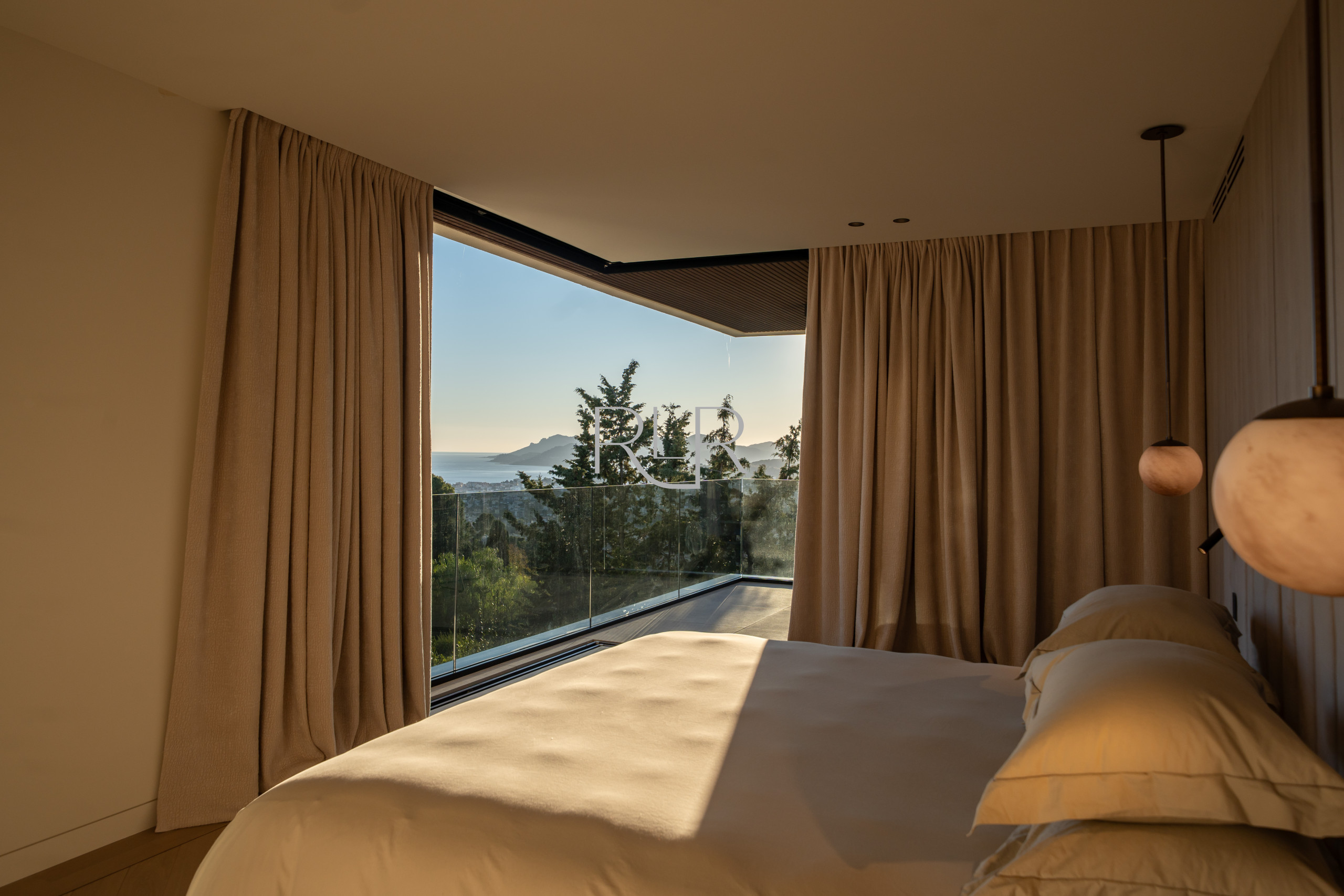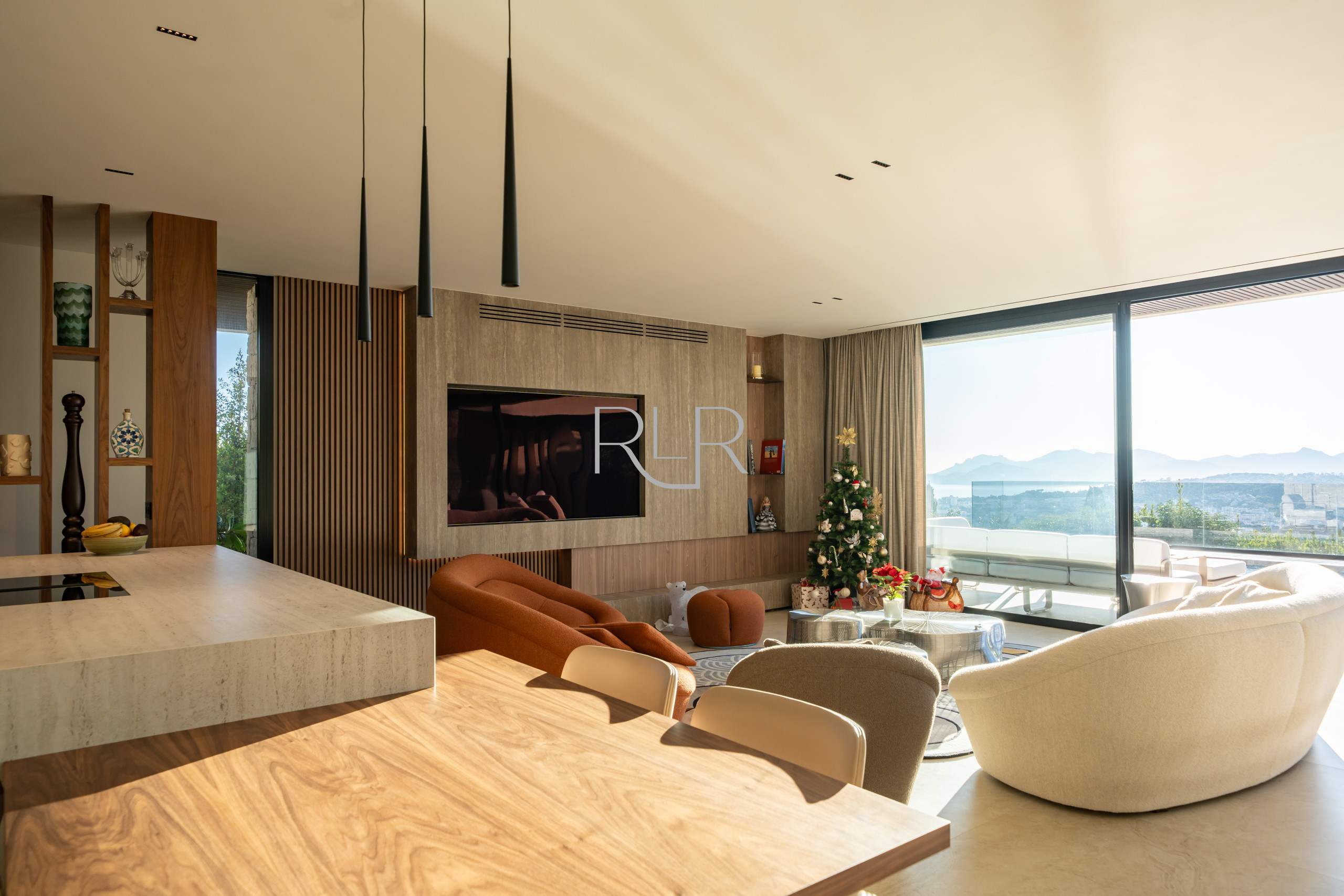 Le spacieux salon, baigné de lumière grâce à ses grandes baies vitrées, s’ouvre sur une terrasse avec piscine chauffée au sel (10x4m) offrant une vue panoramique imprenable sur les îles de Lérins et le massif de l’Estérel.