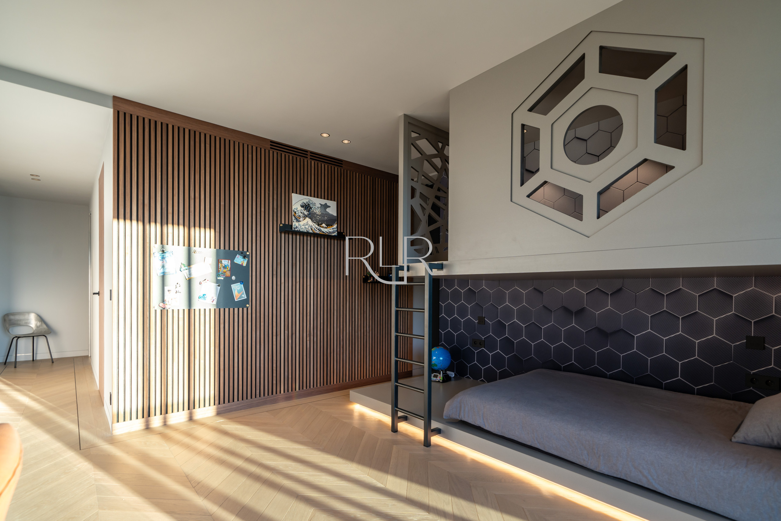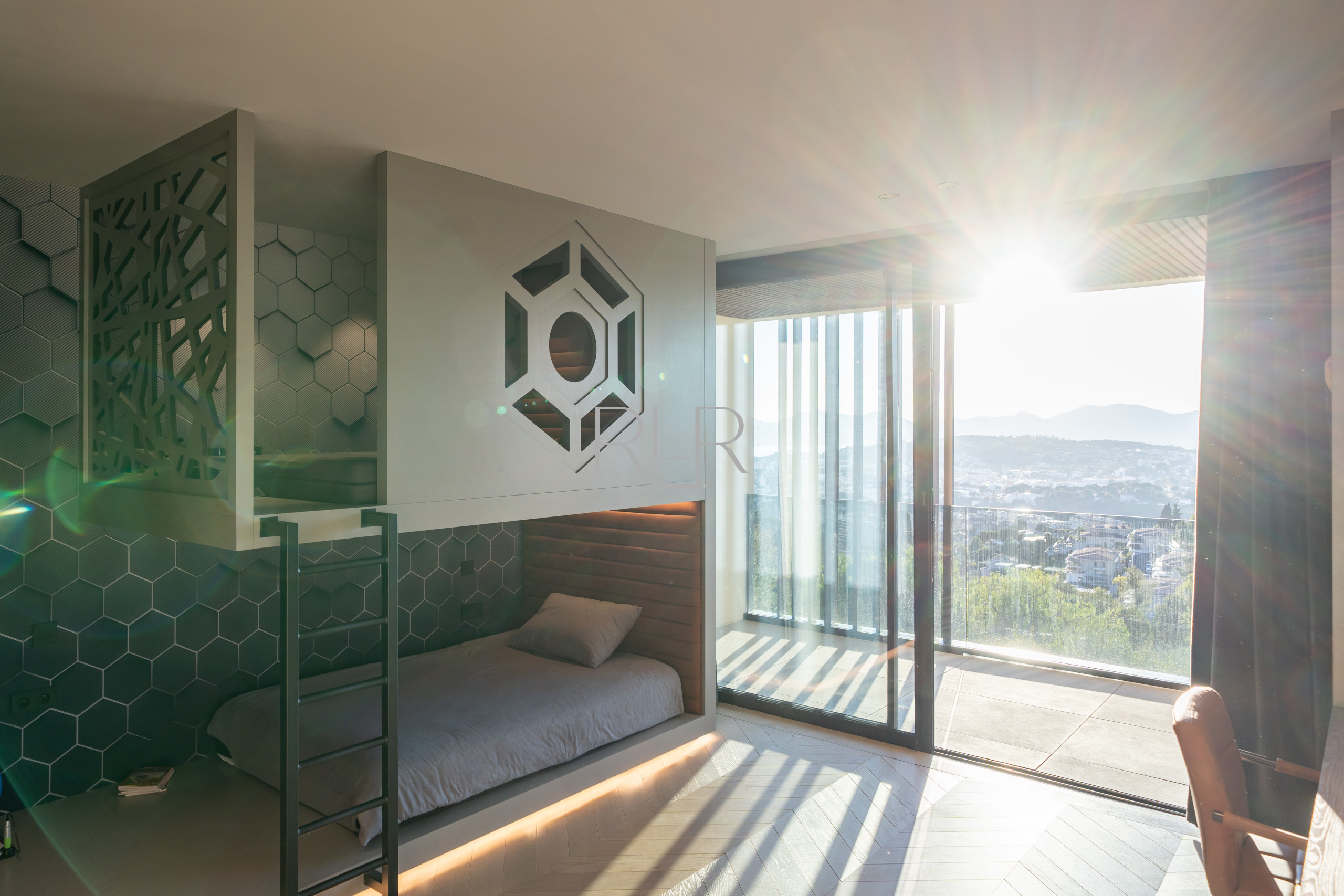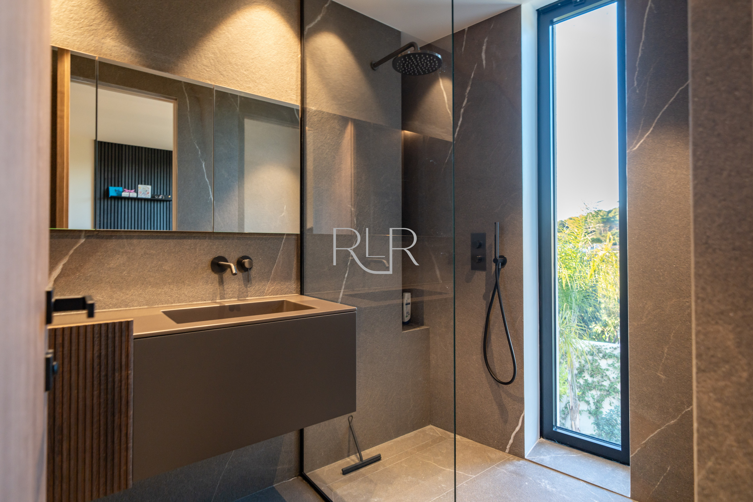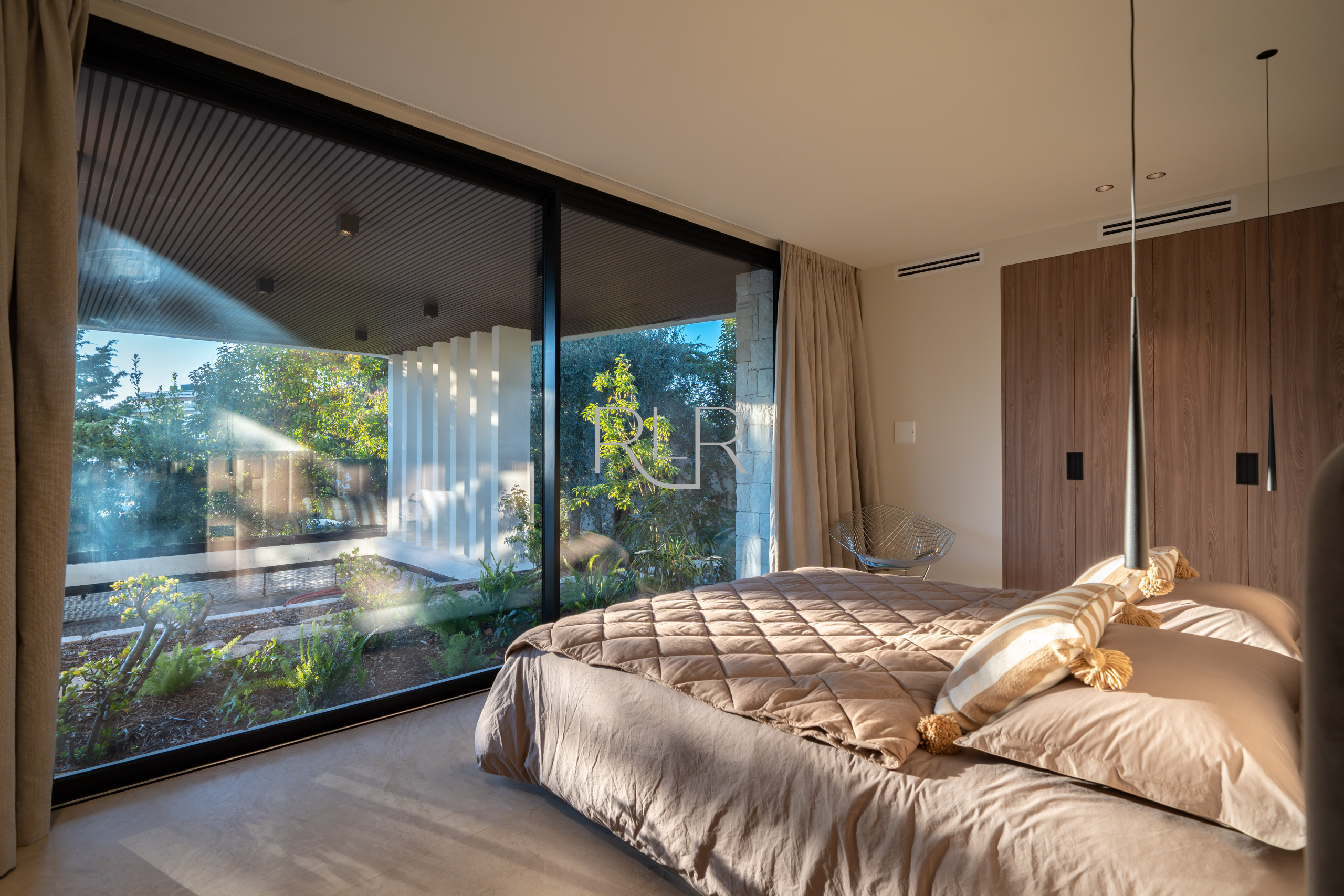 Le spacieux salon, baigné de lumière grâce à ses grandes baies vitrées, s’ouvre sur une terrasse avec piscine chauffée au sel (10x4m) offrant une vue panoramique imprenable sur les îles de Lérins et le massif de l’Estérel.