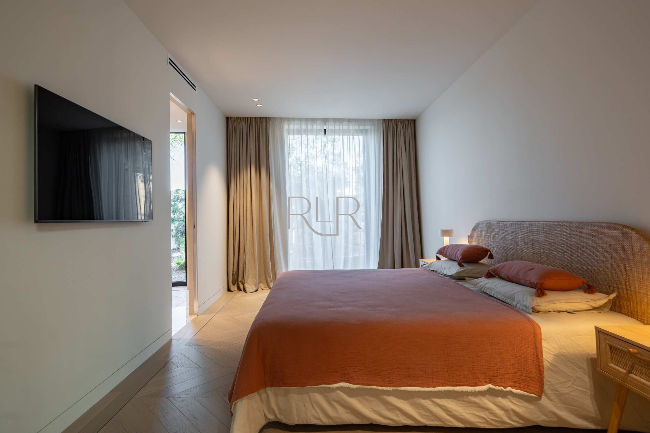 Chambre 1 : suite parentale (lit 160 cm), TV, salle de bain attenante avec baignoire, douche séparée, double vasque et WC. Accès direct à la piscine et vue mer