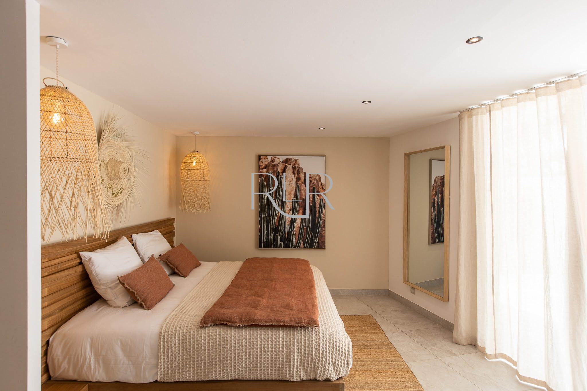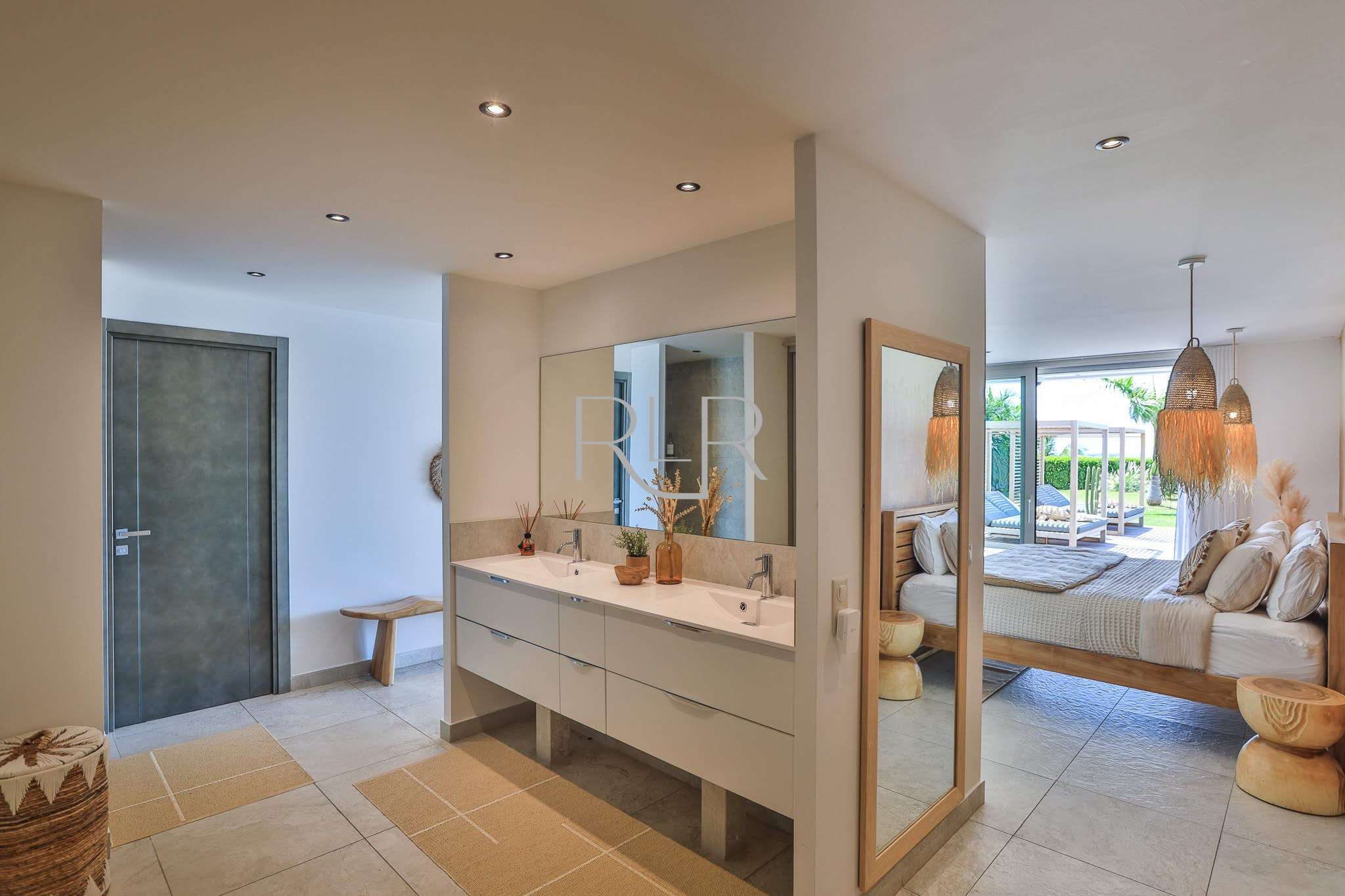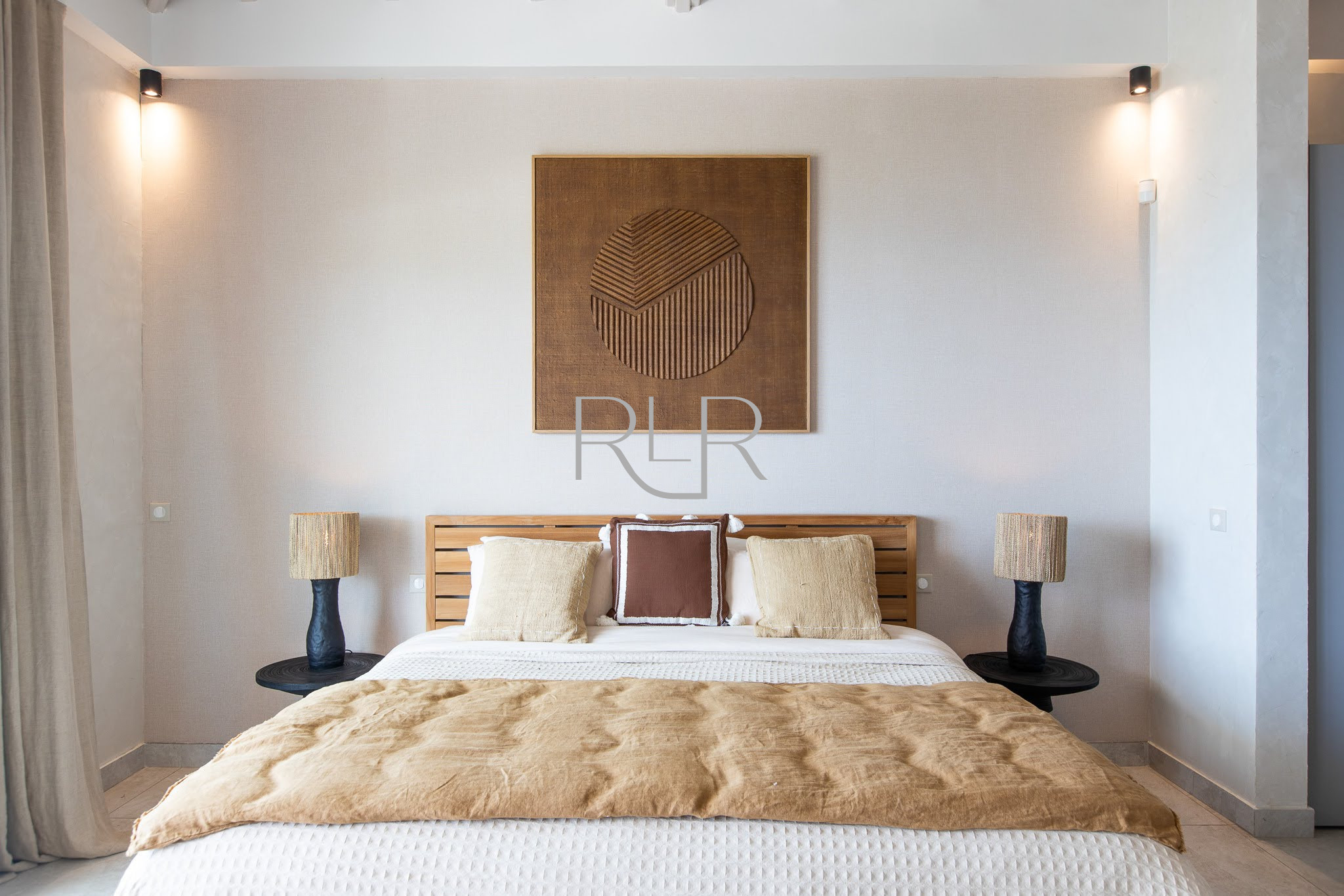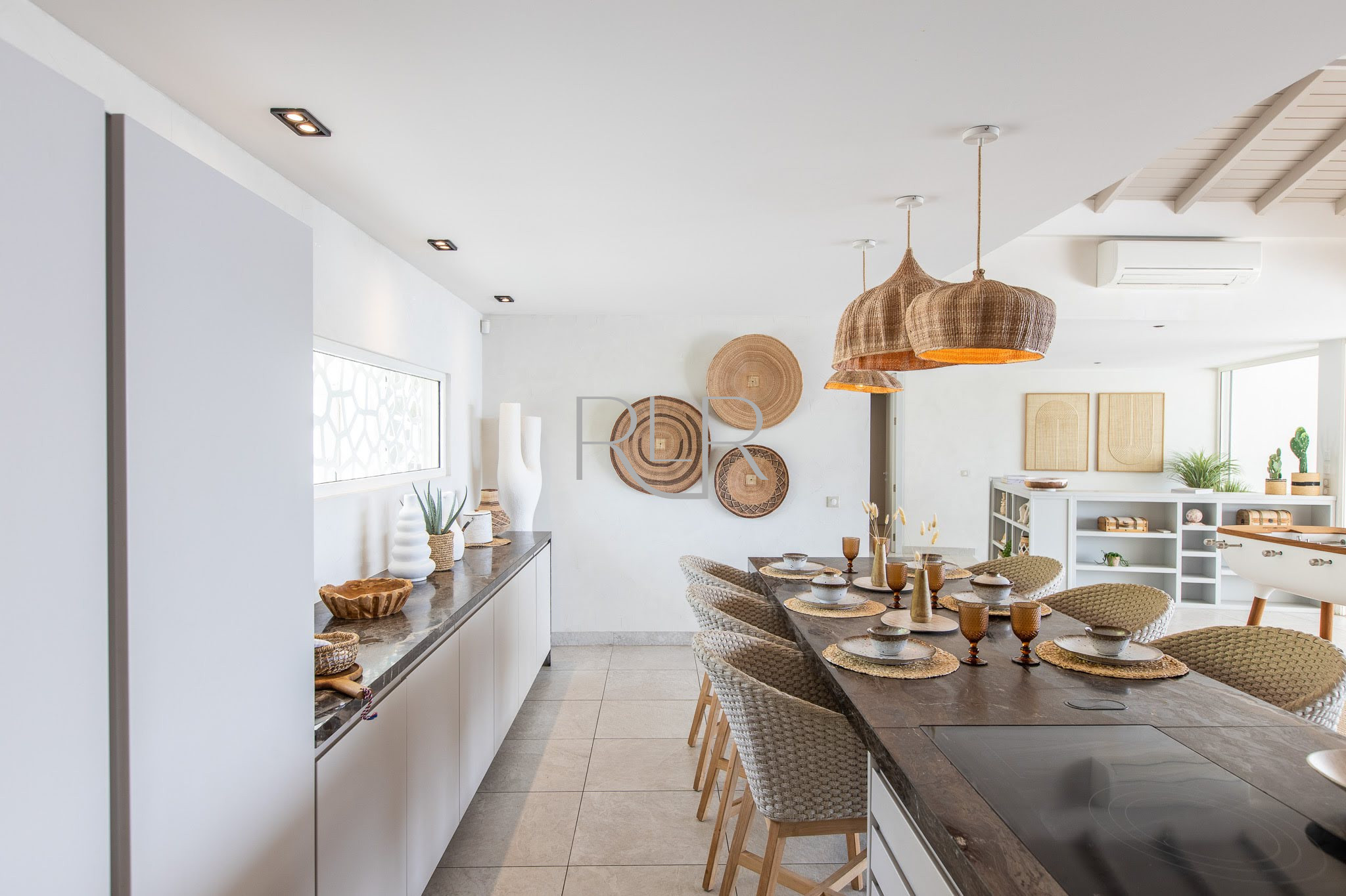 Le rez-de-chaussée comprend un salon et une salle à manger ouverts et baignés de lumière naturelle, qui donnent sur une terrasse spacieuse, idéale pour les repas en plein air et la détente. Deux chambres avec salle de bains privative sont situées à ce niveau, avec une décoration sereine et des finitions haut de gamme.
