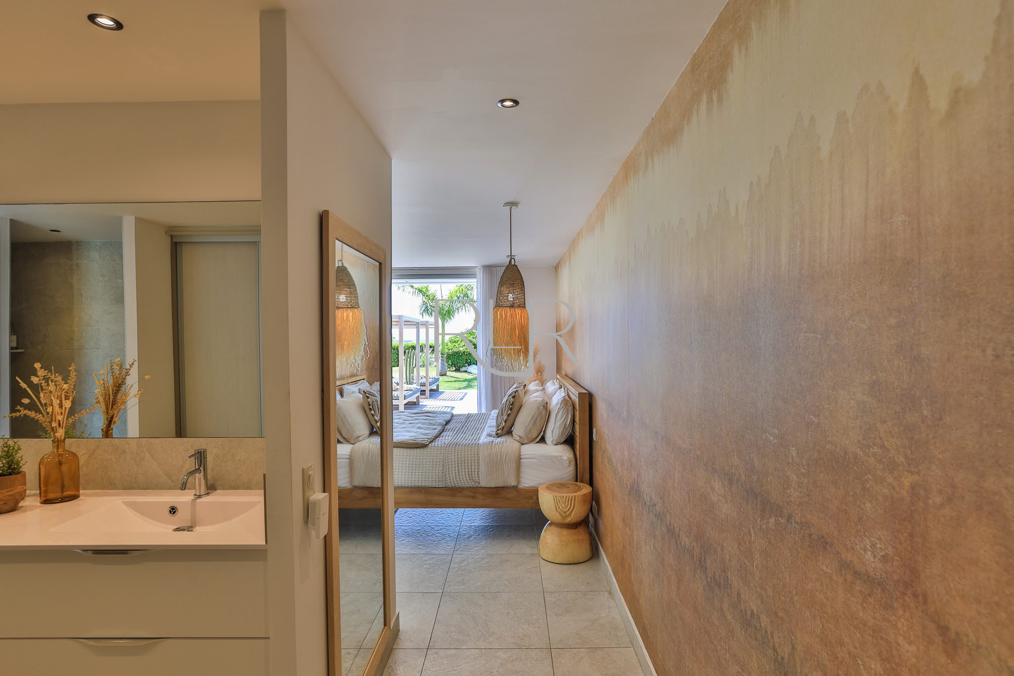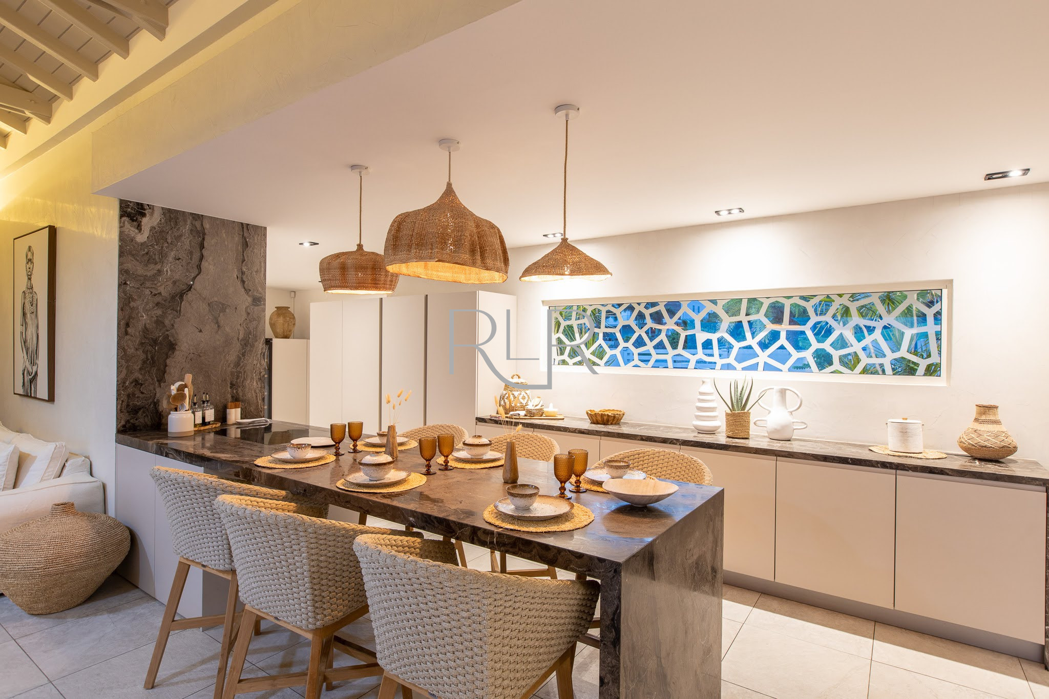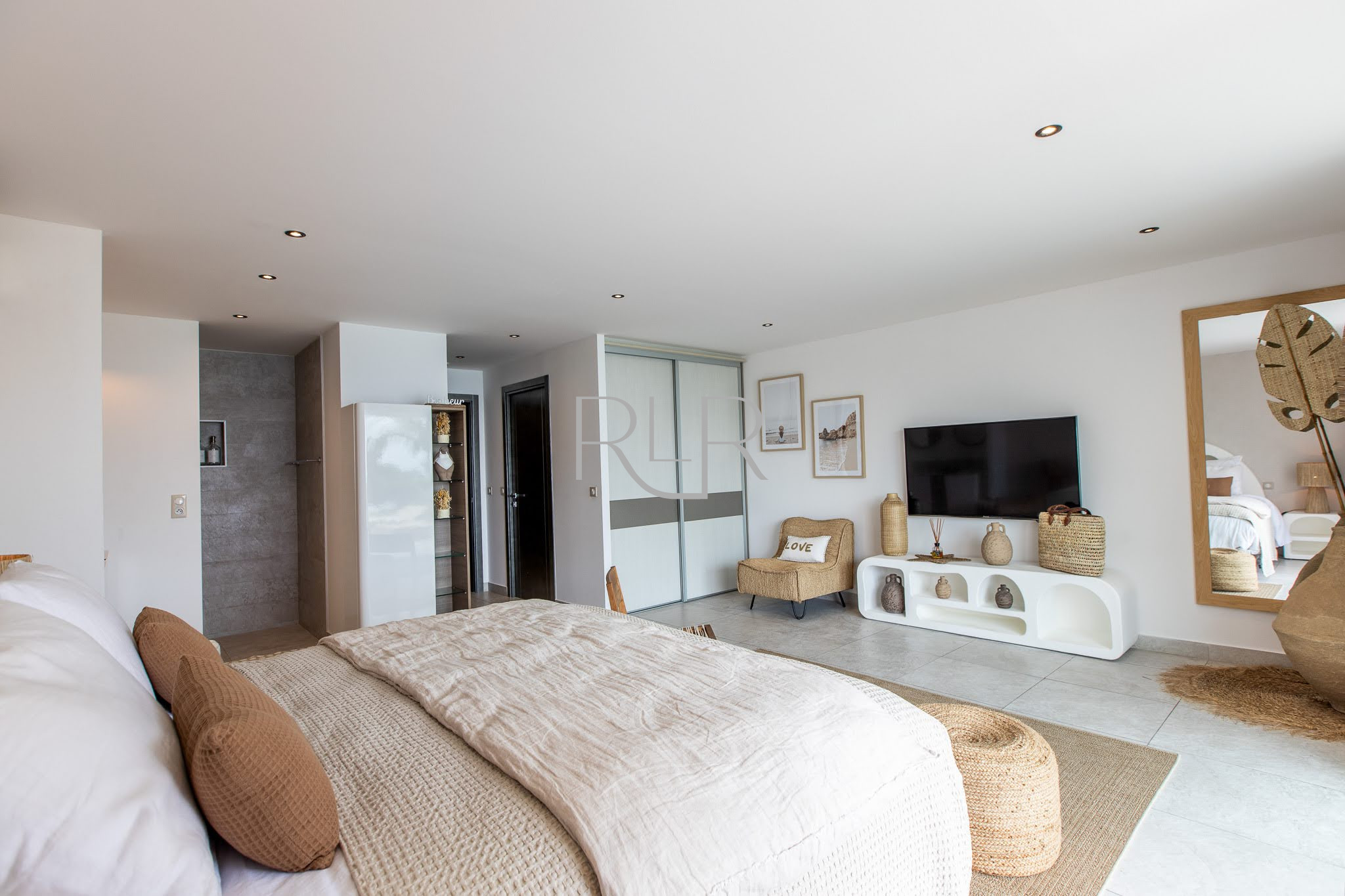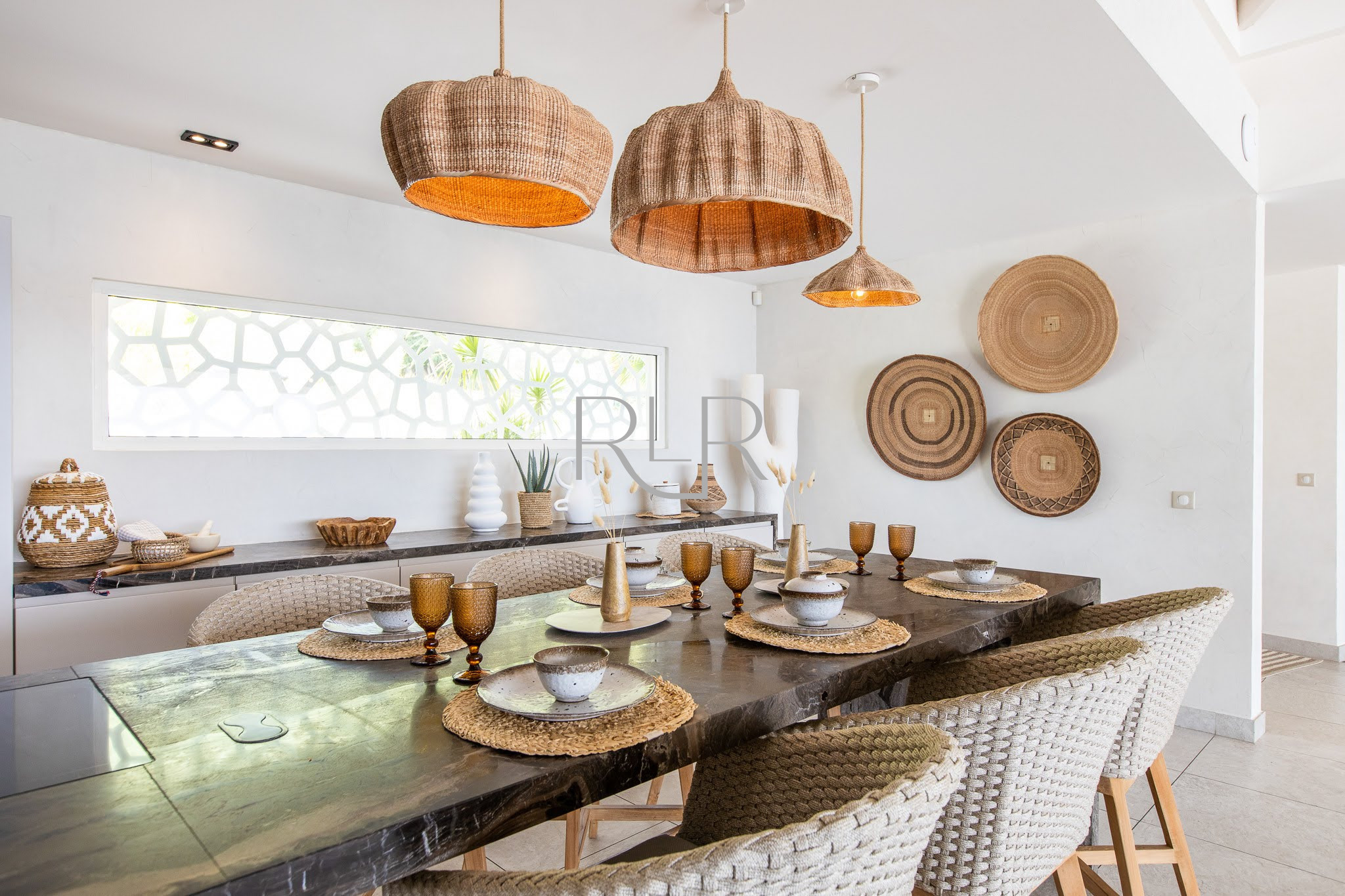 Le rez-de-chaussée comprend un salon et une salle à manger ouverts et baignés de lumière naturelle, qui donnent sur une terrasse spacieuse, idéale pour les repas en plein air et la détente. Deux chambres avec salle de bains privative sont situées à ce niveau, avec une décoration sereine et des finitions haut de gamme.