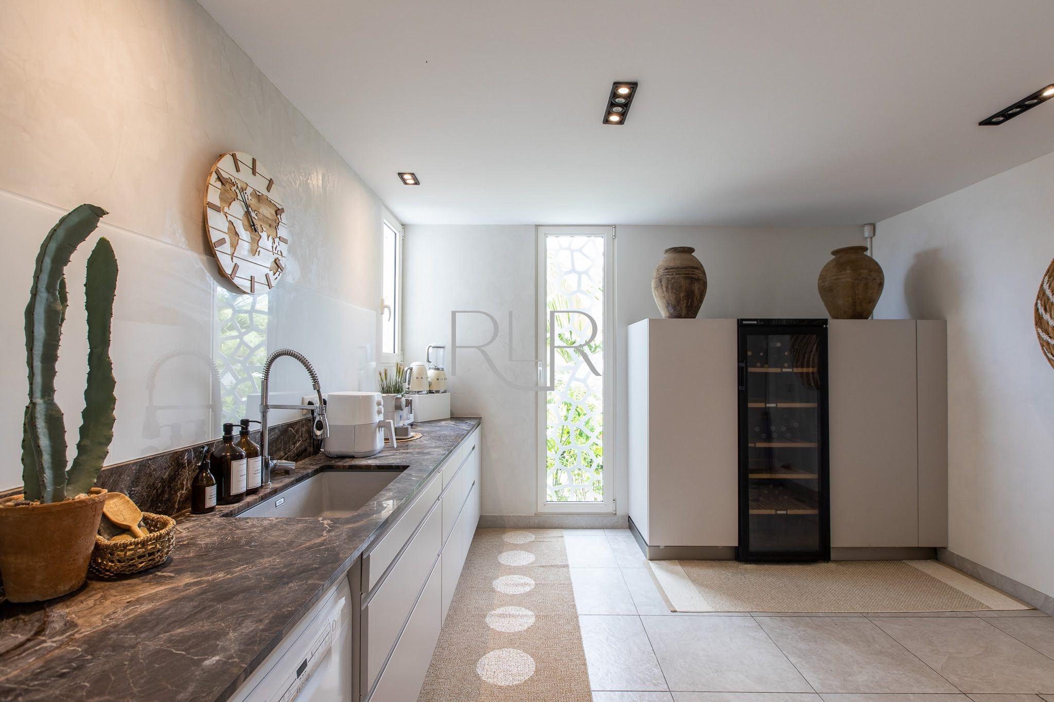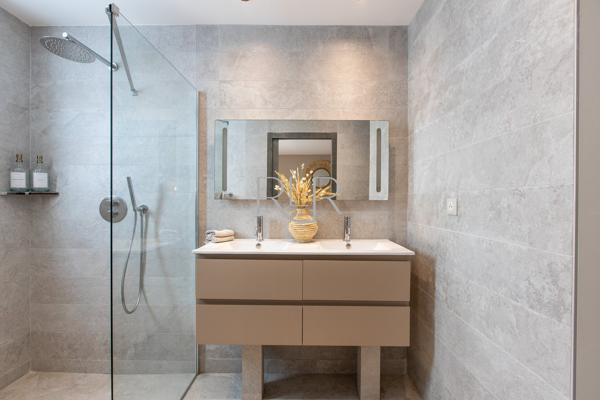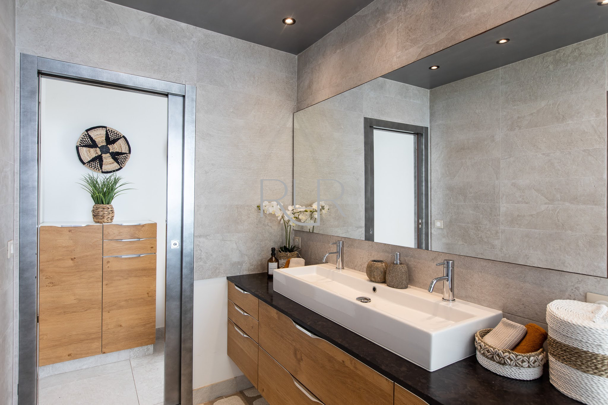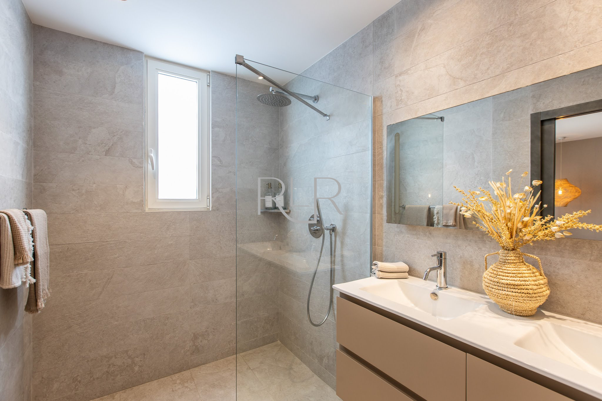 Le rez-de-chaussée comprend un salon et une salle à manger ouverts et baignés de lumière naturelle, qui donnent sur une terrasse spacieuse, idéale pour les repas en plein air et la détente. Deux chambres avec salle de bains privative sont situées à ce niveau, avec une décoration sereine et des finitions haut de gamme.