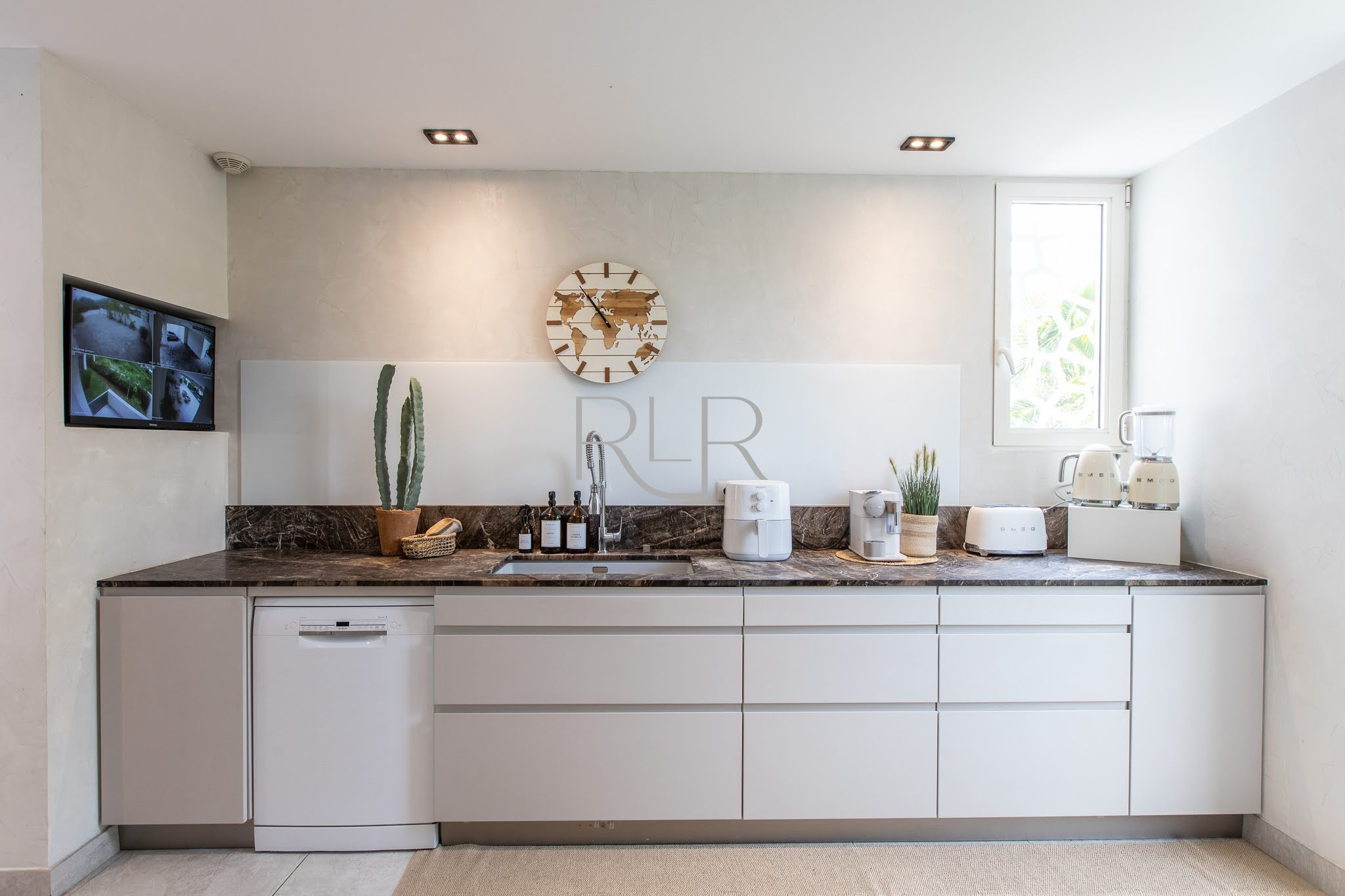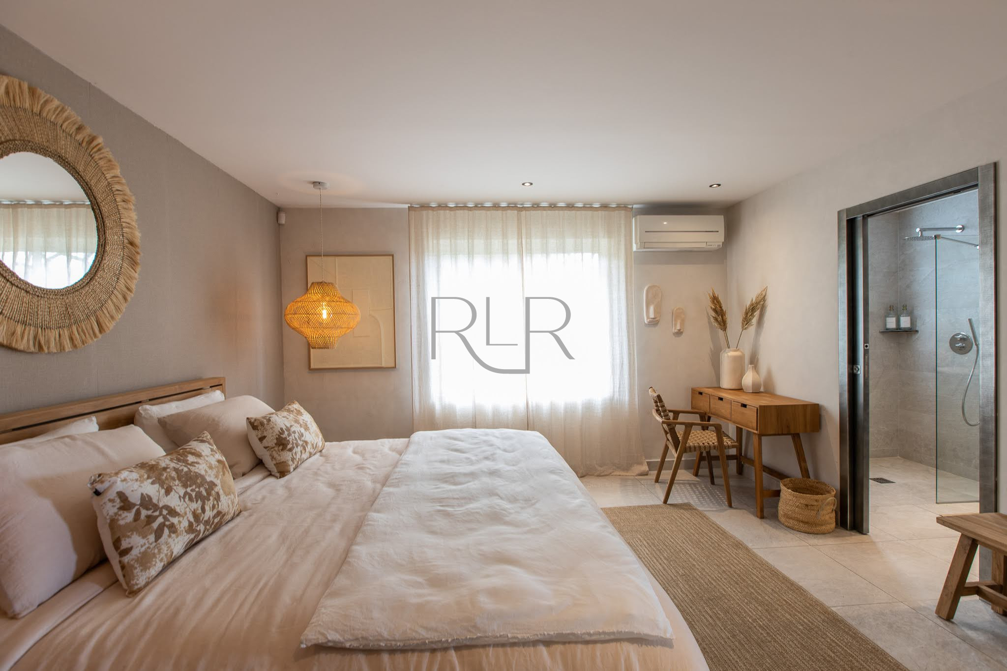 Au rez-de-chaussée, trois chambres supplémentaires, dont deux avec accès direct à la piscine, offrent intimité et confort, chacune avec sa propre salle de bains attenante. La piscine privée, entourée de chaises longues, constitue une oasis de paix pour prendre le soleil et se baigner.