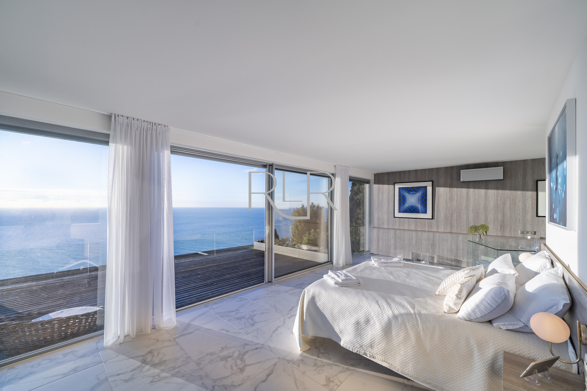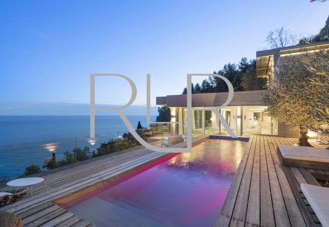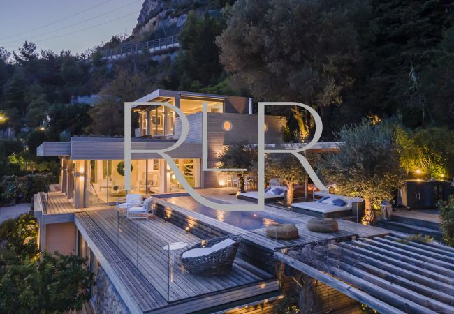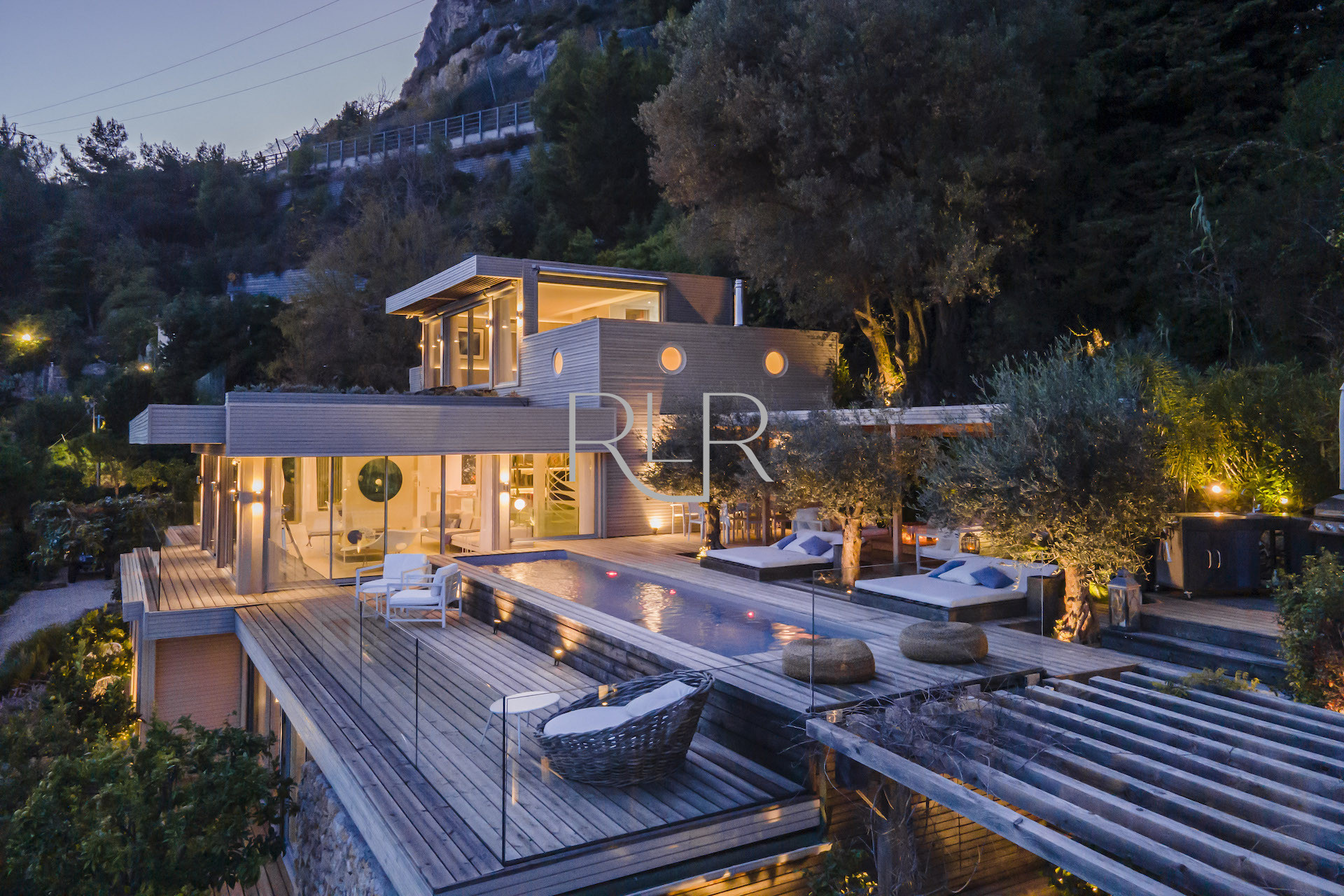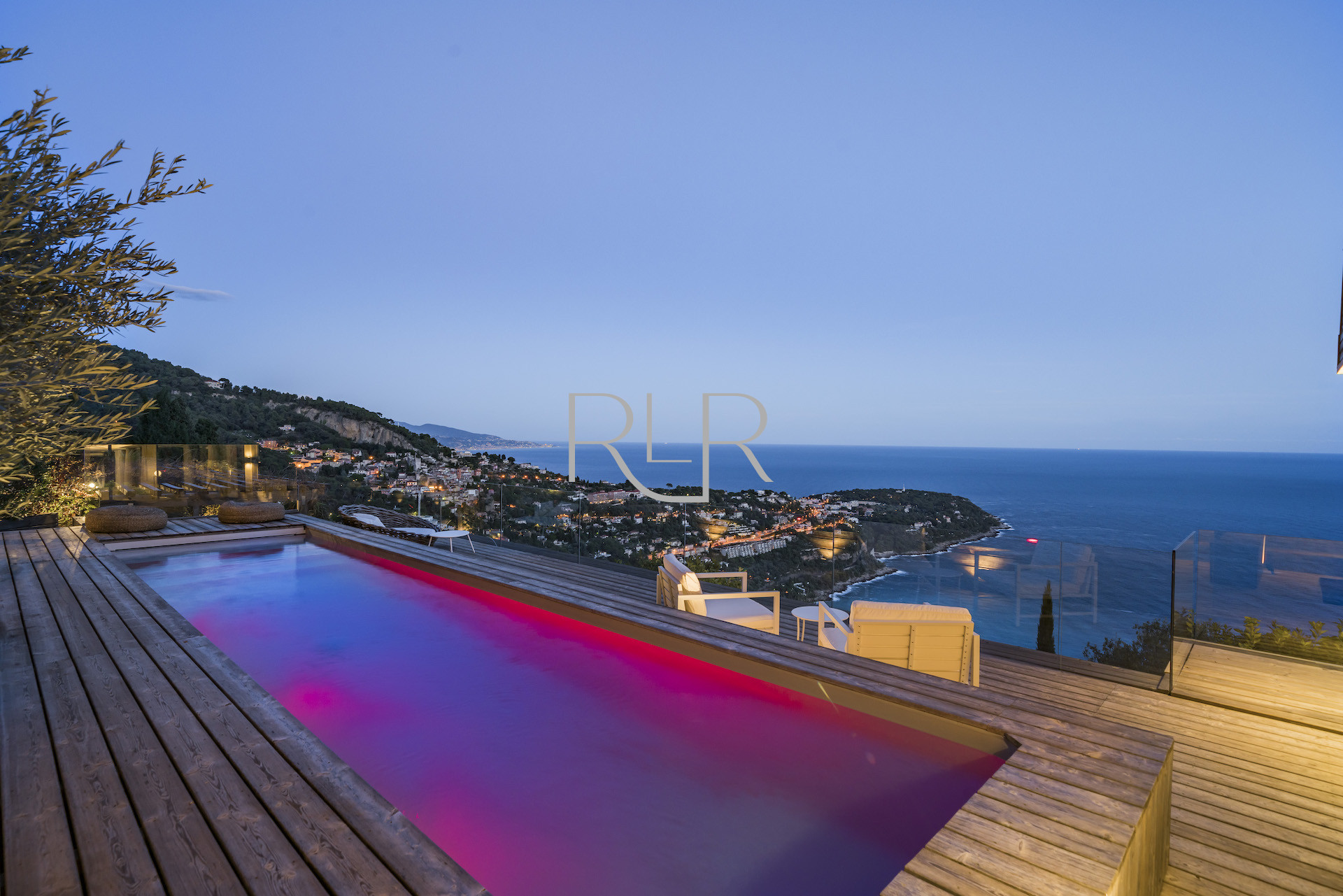 Nichée à flanc de colline à Roquebrune-Cap-Martin, la Villa Scarlett est une propriété neuve et spectaculaire, offrant certaines des vues mer les plus époustouflantes de la Riviera.