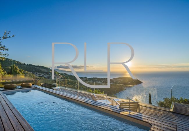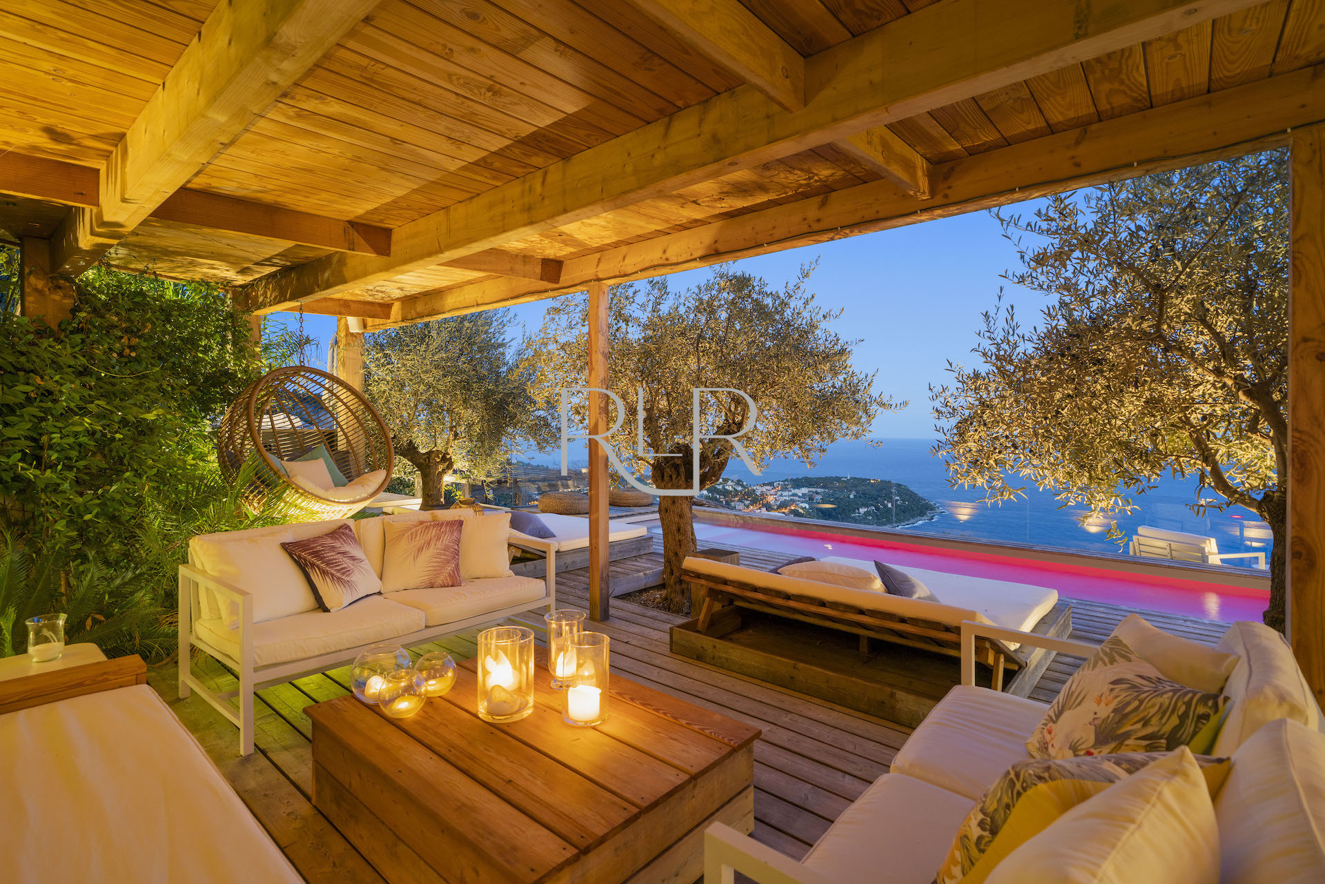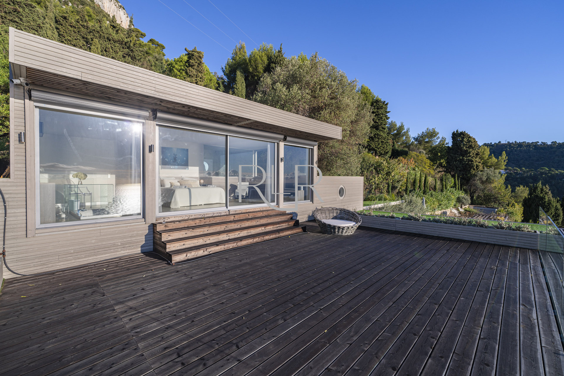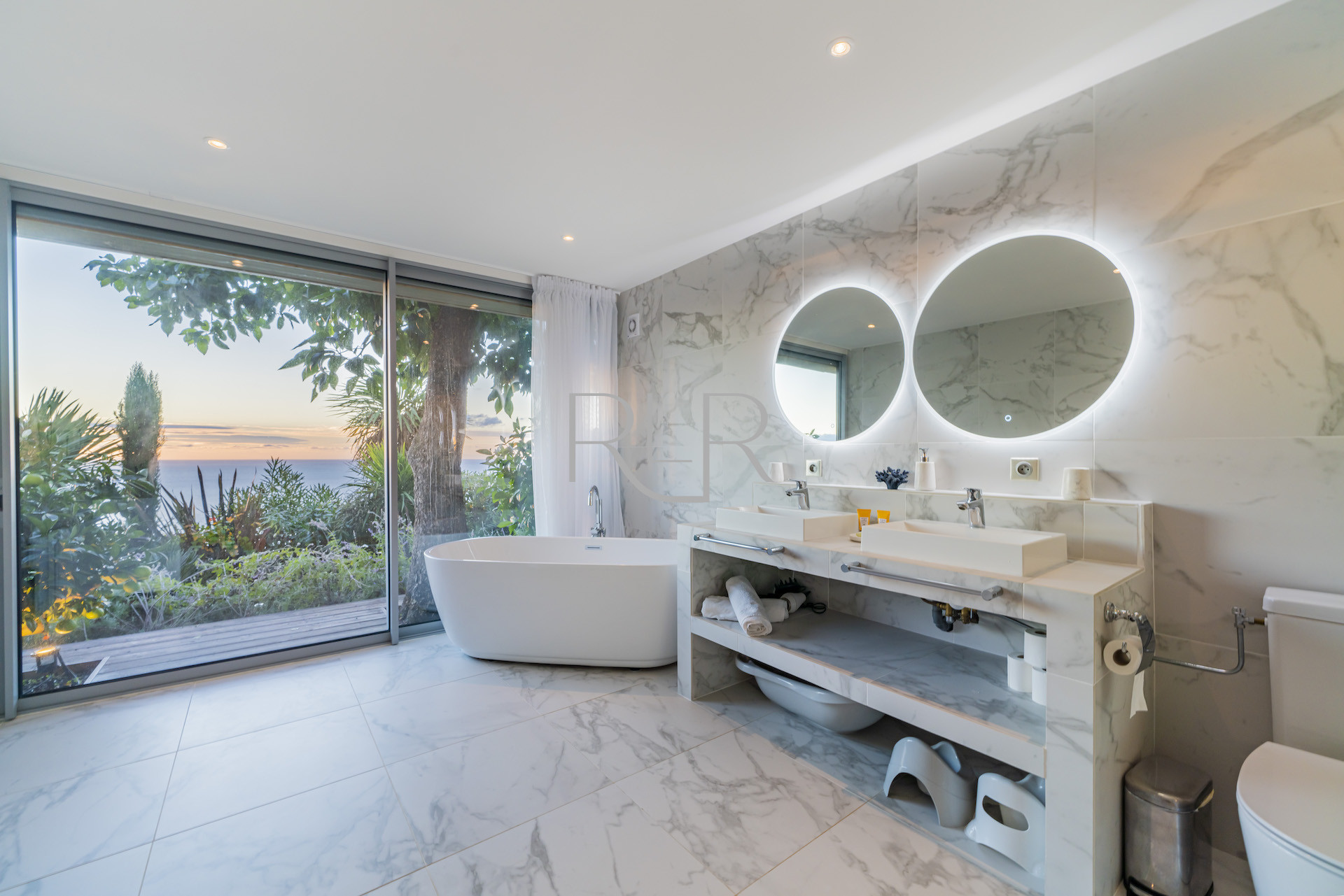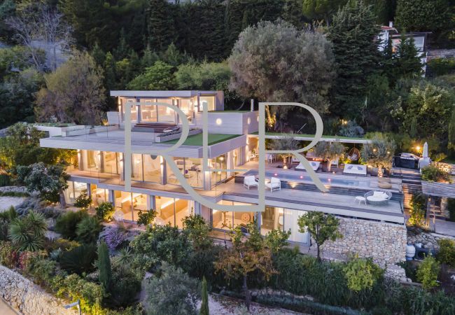 Nichée à flanc de colline à Roquebrune-Cap-Martin, la Villa Scarlett est une propriété neuve et spectaculaire, offrant certaines des vues mer les plus époustouflantes de la Riviera.
