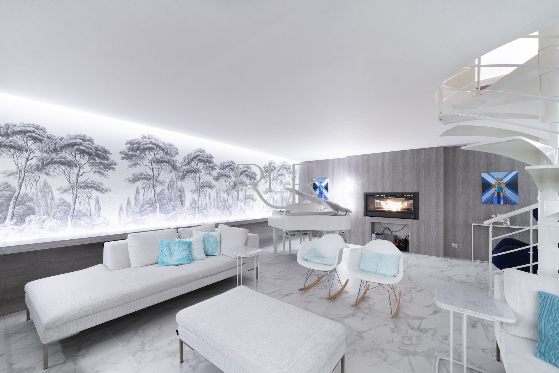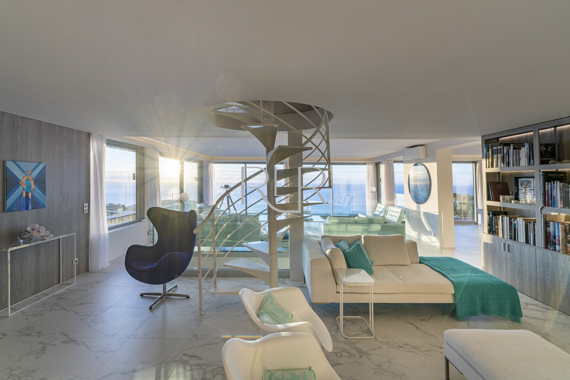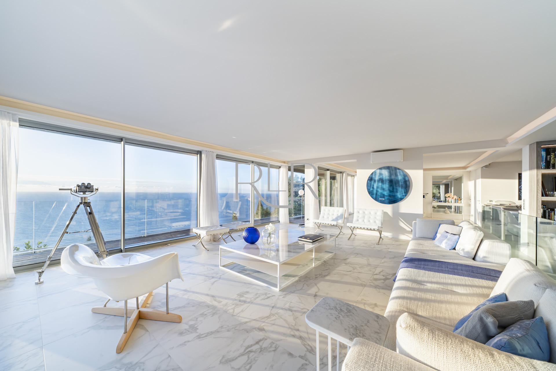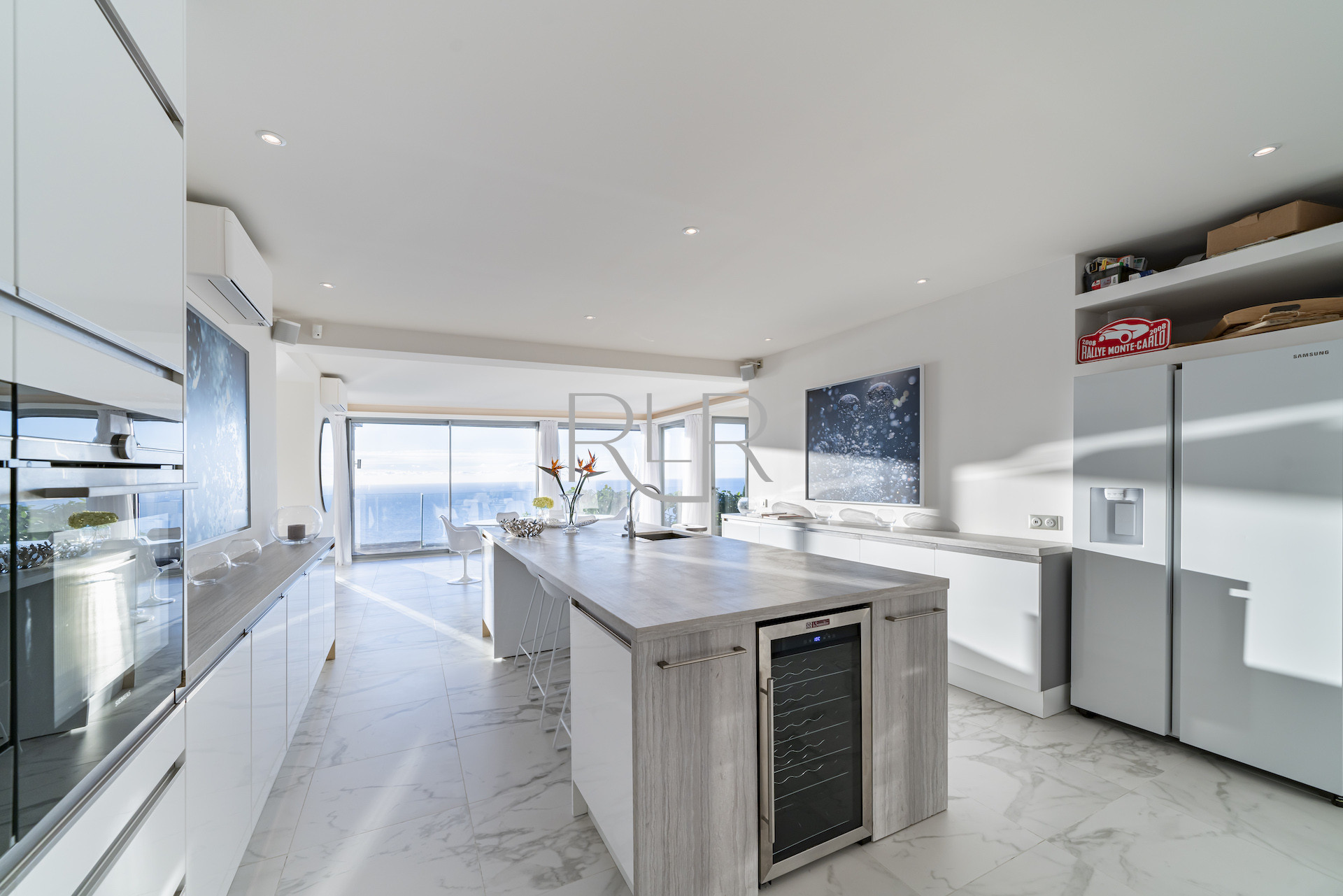 La cuisine high-tech ouverte donne sur un vaste salon baigné de lumière grâce à de larges baies vitrées offrant une vue imprenable sur la mer.