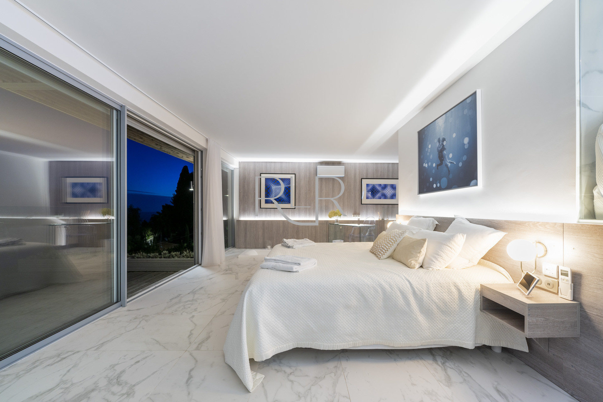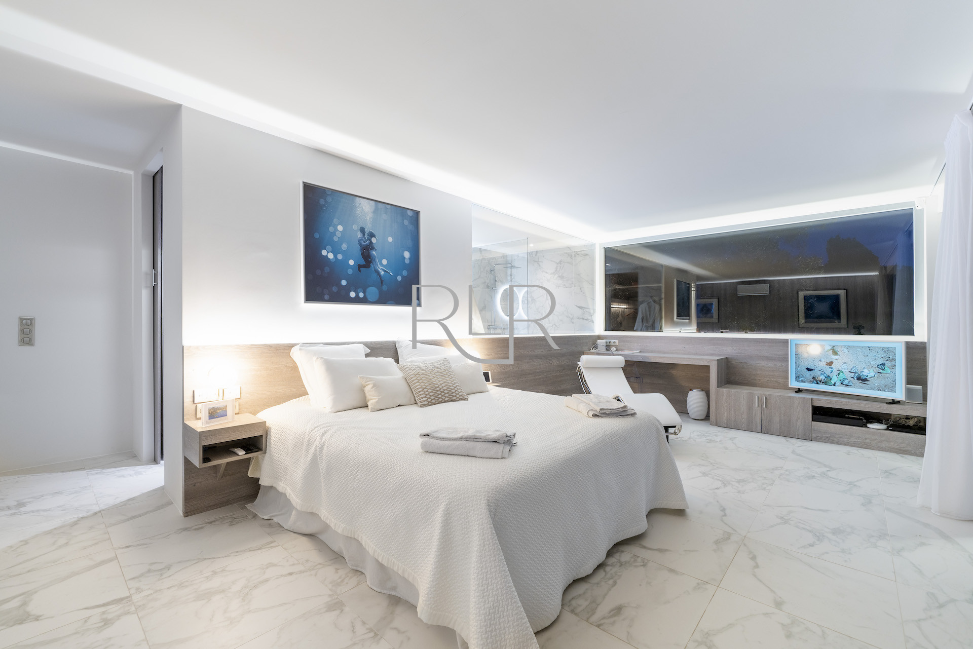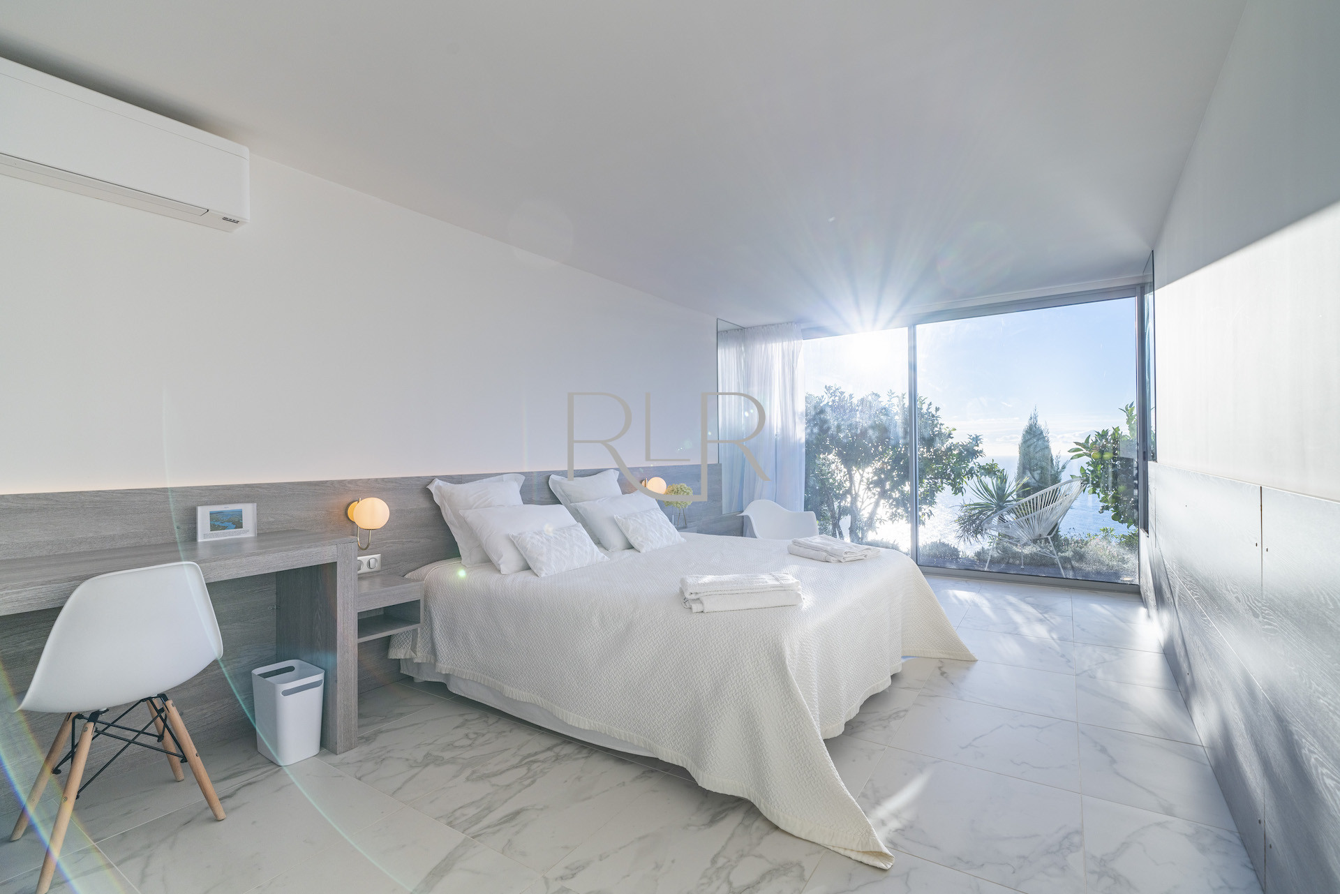 La villa comprend 5 chambres, dont une suite parentale occupant tout l’étage supérieur, pensée pour offrir une vue panoramique depuis le lit et chaque recoin de la pièce. Les autres suites bénéficient elles aussi de vues mer et de salles de bains somptueuses.