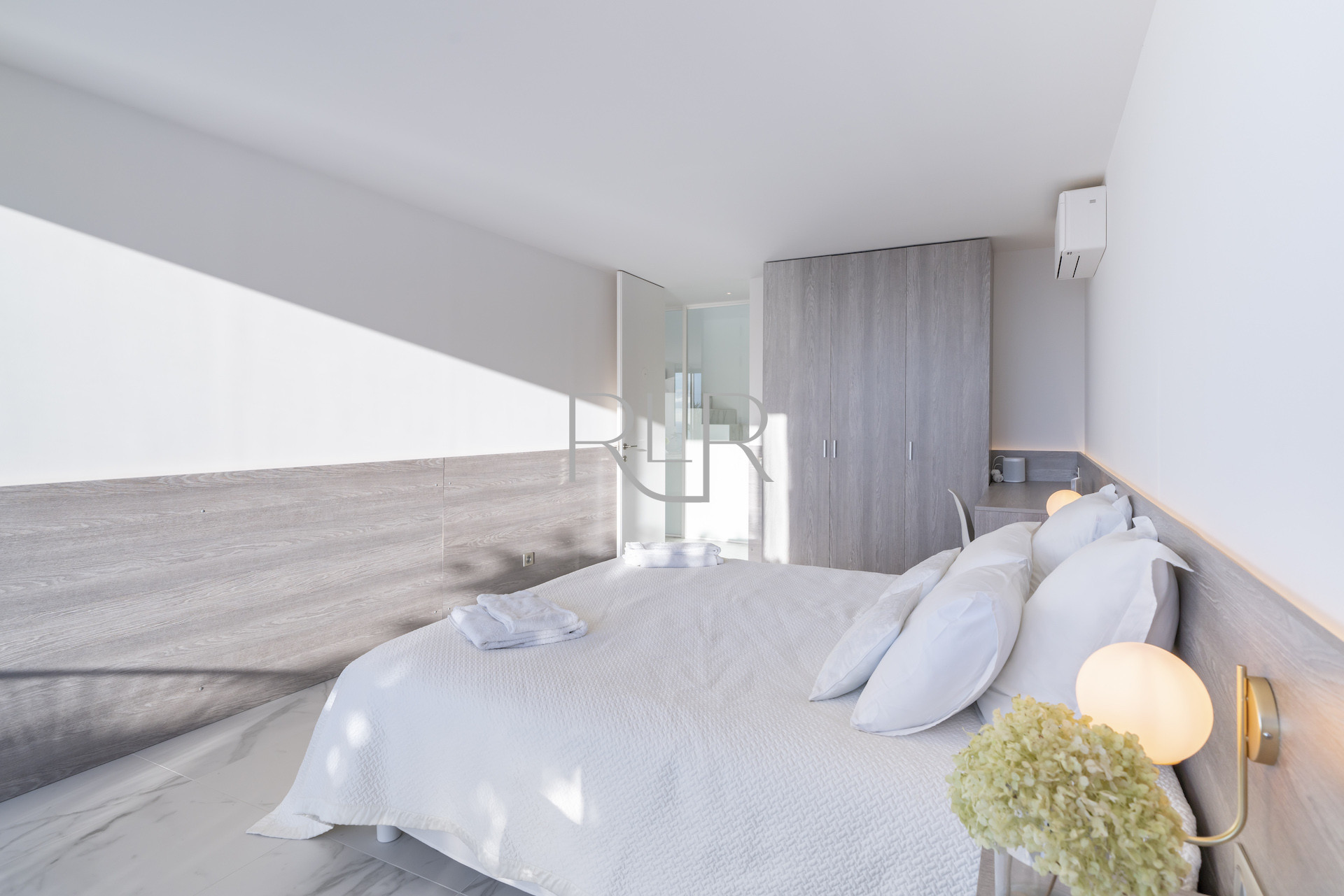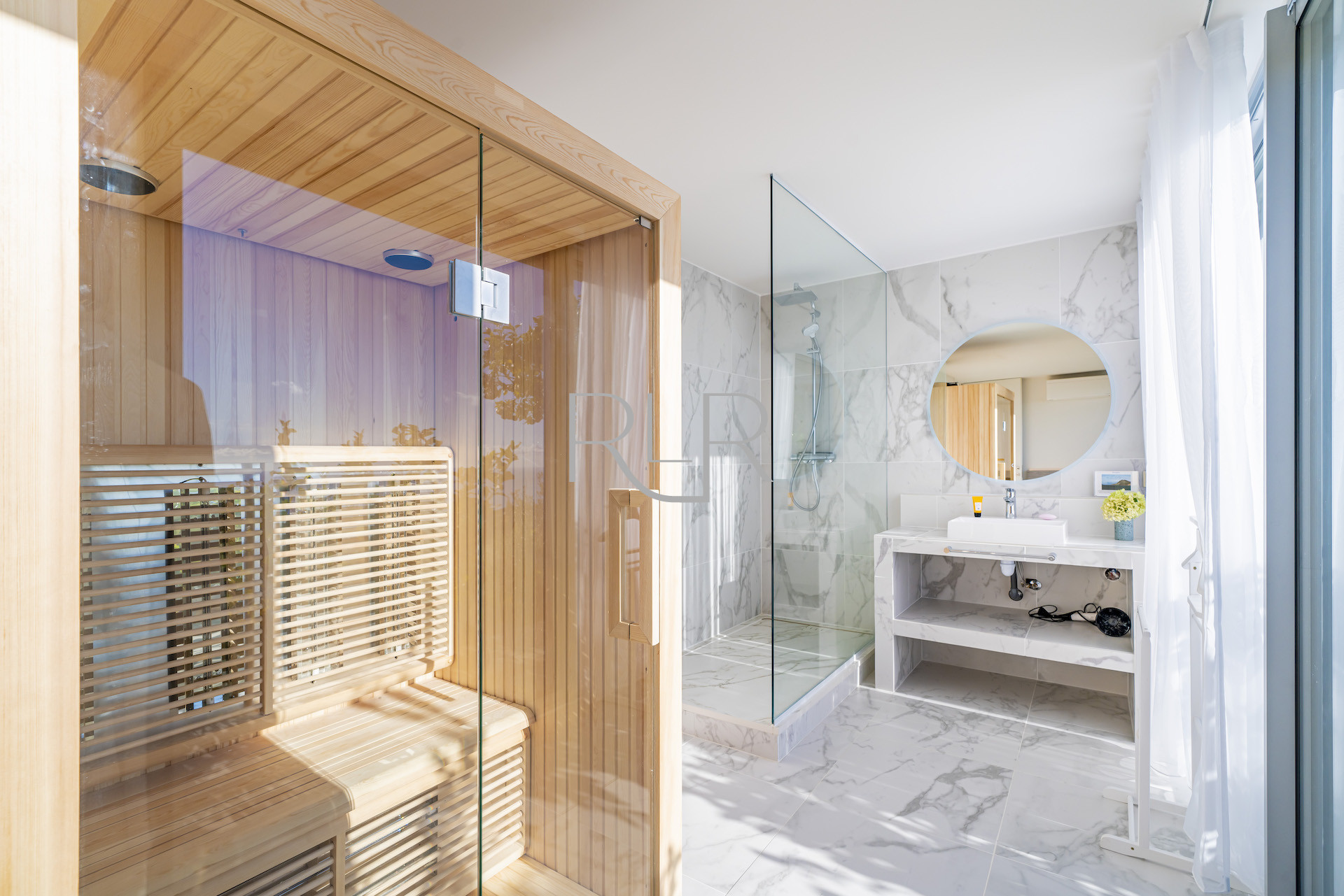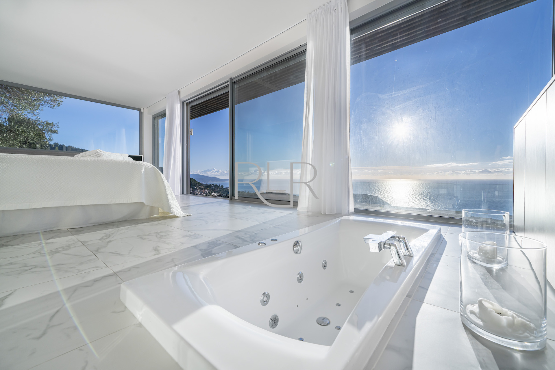 La villa comprend 5 chambres, dont une suite parentale occupant tout l’étage supérieur, pensée pour offrir une vue panoramique depuis le lit et chaque recoin de la pièce. Les autres suites bénéficient elles aussi de vues mer et de salles de bains somptueuses.