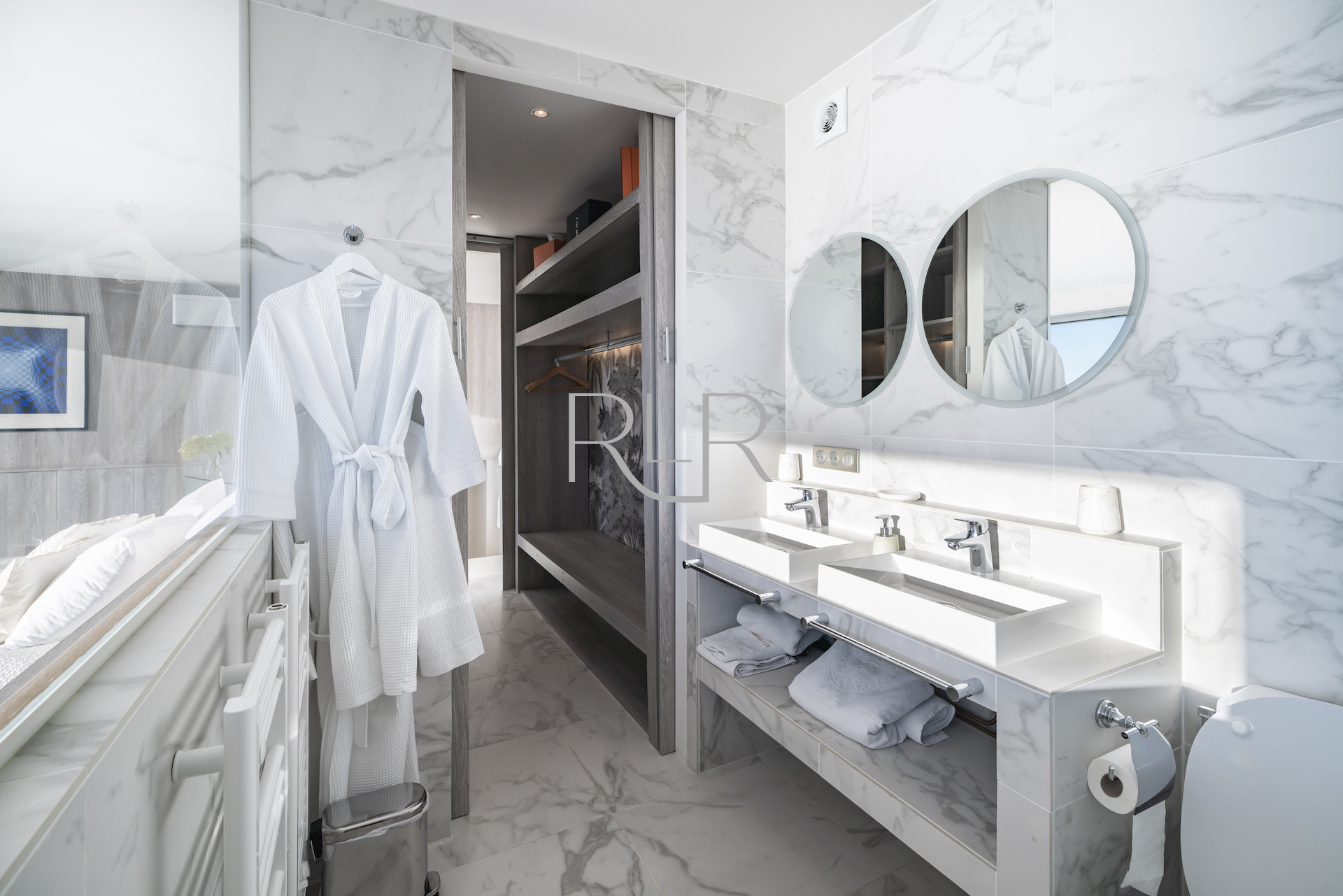Chambre 1 (Master) : lit double 180 cm, TV, salle de douche en suite avec double vasque, WC, baignoire dans la chambre, dressing, climatisation