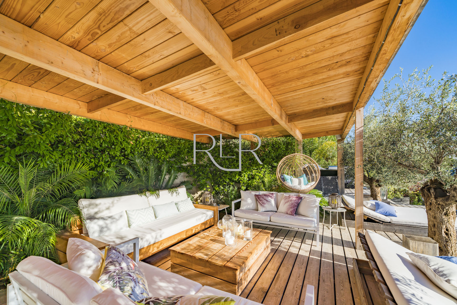 Grande terrasse avec barbecue, coin repas d’été, salon extérieur, transats