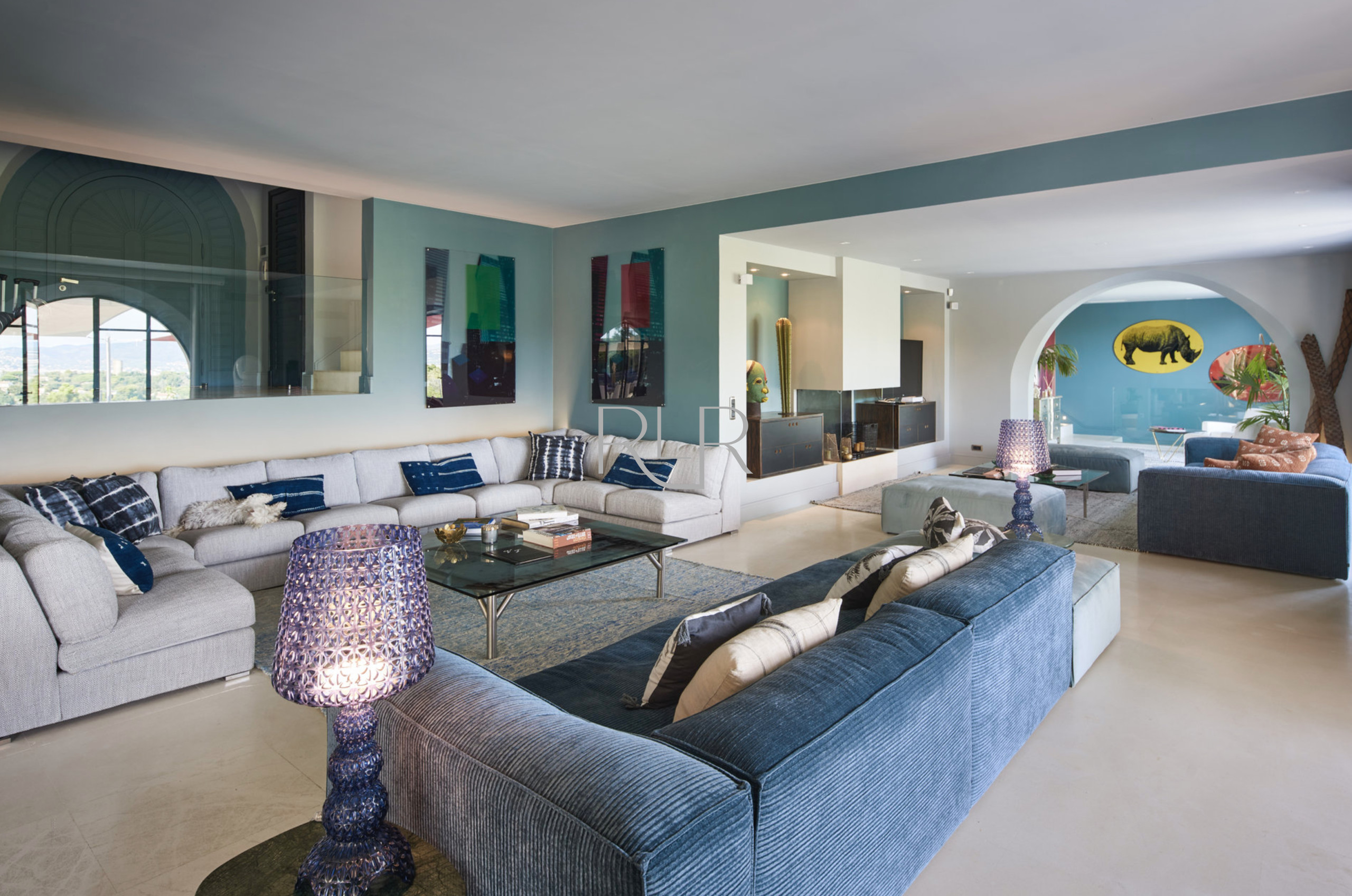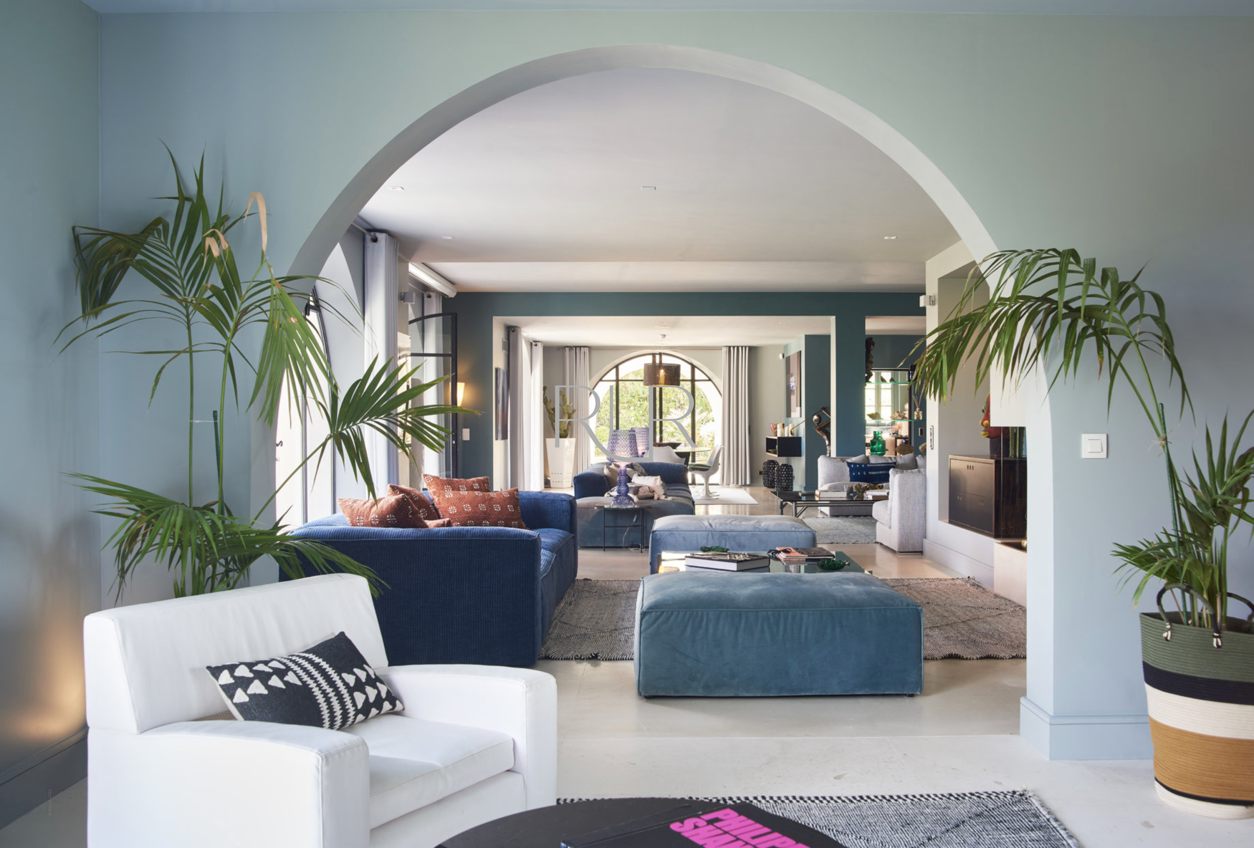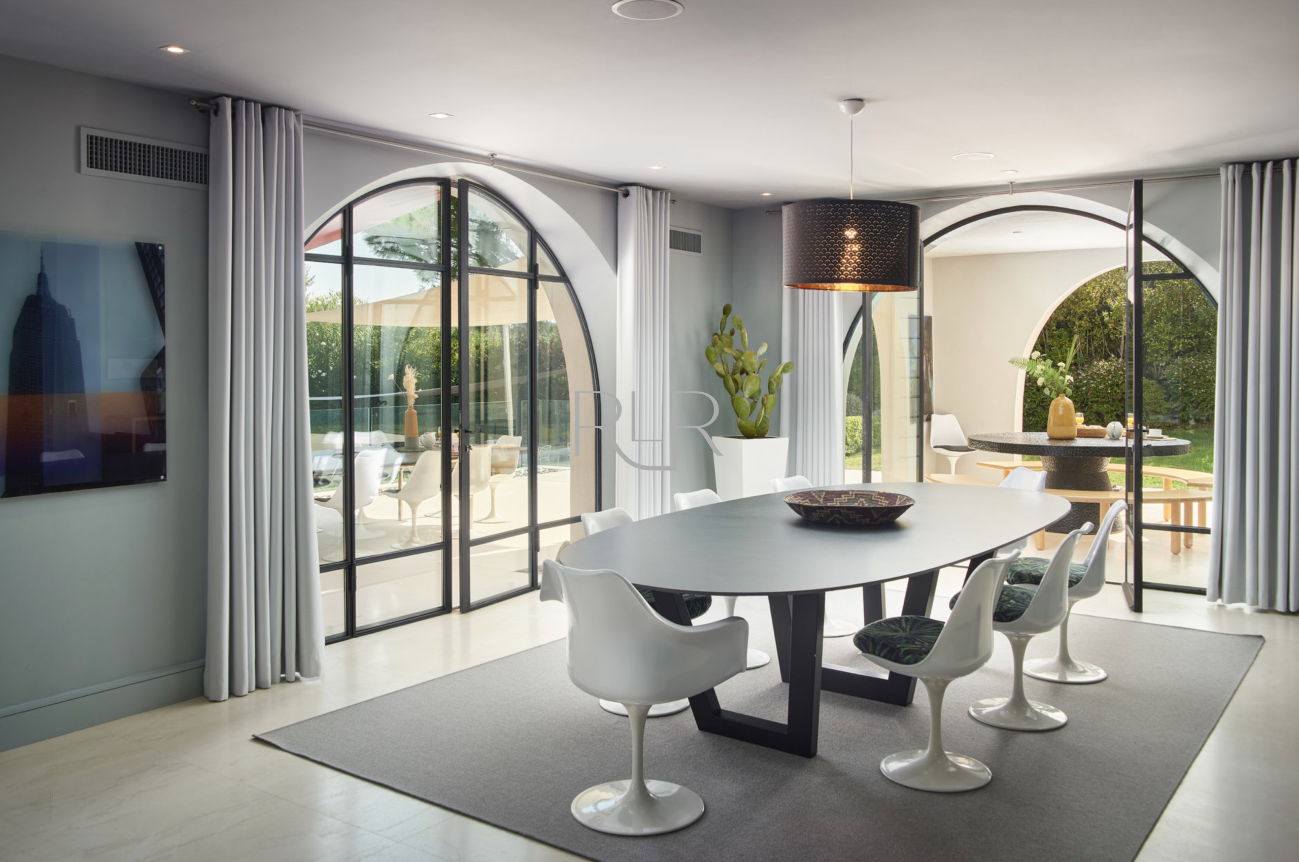 Vaste salon avec espace salle à manger ouvrant sur la terrasse et la piscine