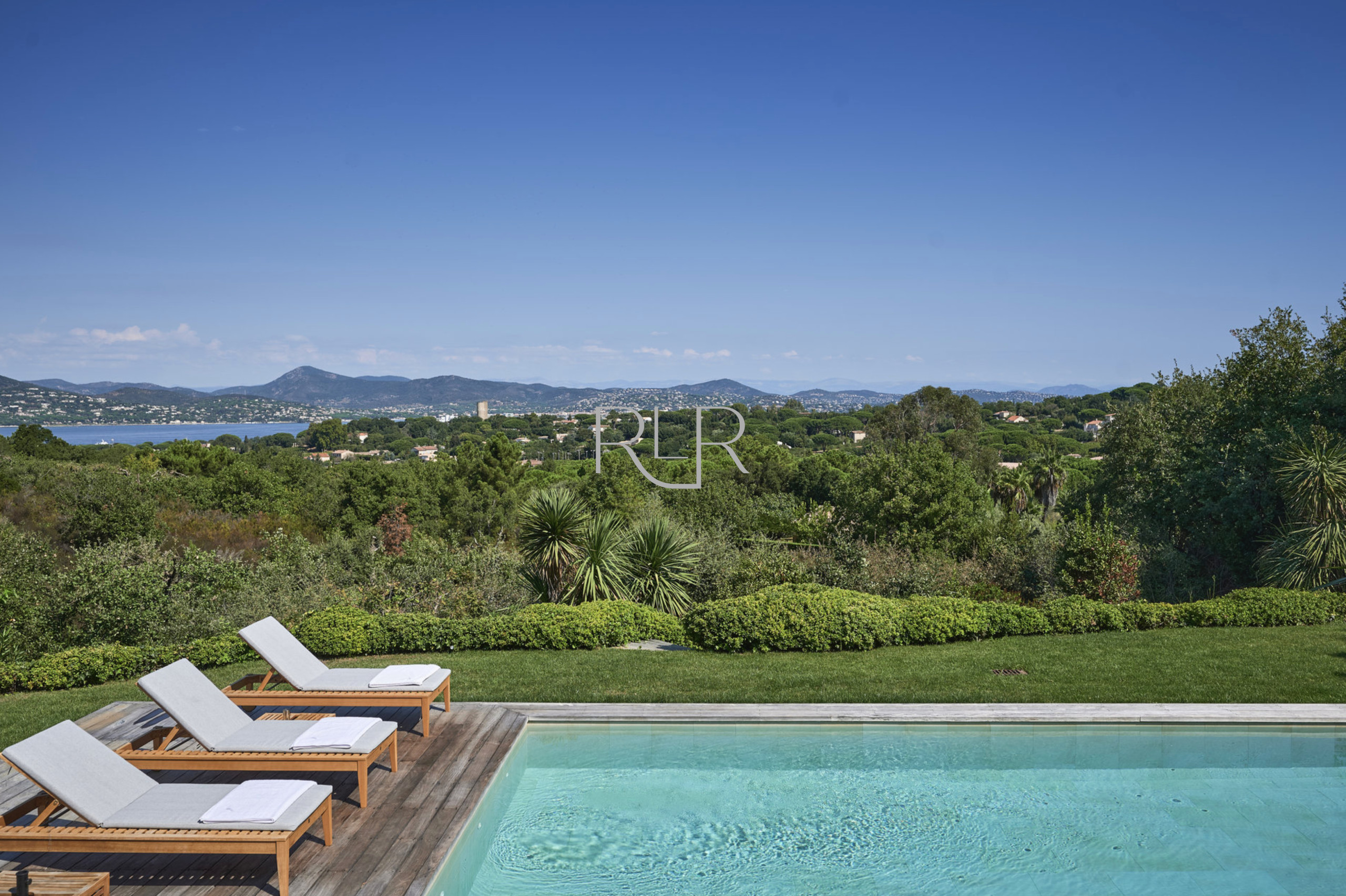 Les espaces de vie lumineux s’ouvrent sur de spacieuses terrasses, idéales pour profiter de l’extérieur tout au long de la journée. La villa est également dotée d’une vaste piscine (16 x 6 m) entourée de transats, parfaite pour se détendre sous le soleil tropézien.