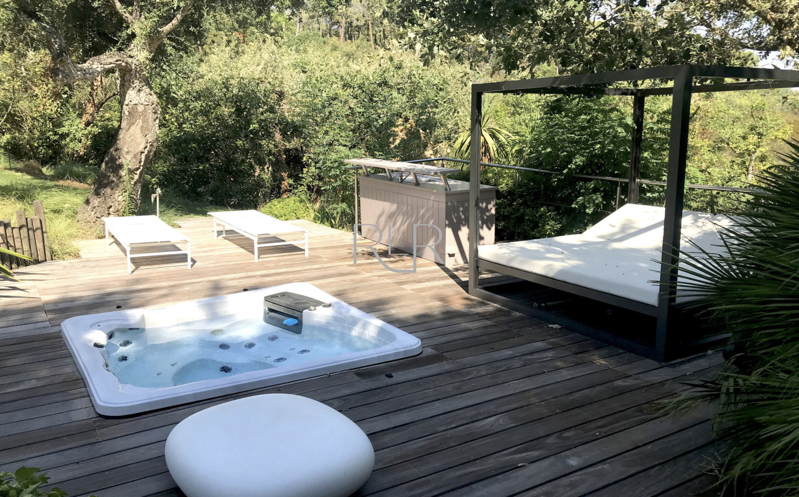 La villa est située sur un terrain paysager d’environ 2 000 m², à l’abri des regards. Elle dispose de nombreuses terrasses aménagées entourant une piscine chauffée de 13 x 6 m, idéales pour la détente.