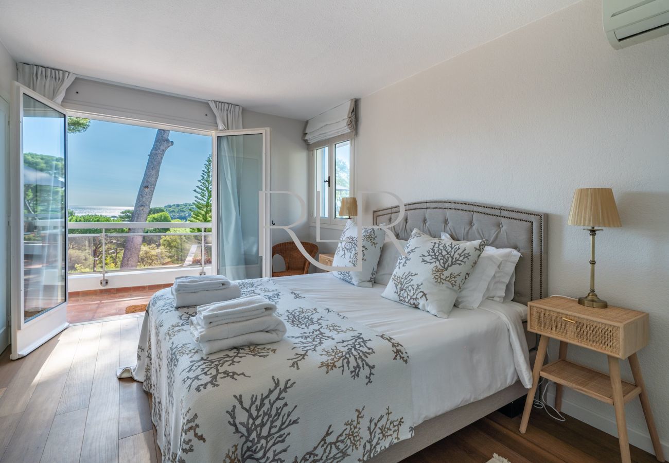 Bedroom 1 with a double bed, its ensuite bathroom, direct access to the terrace and sea views.