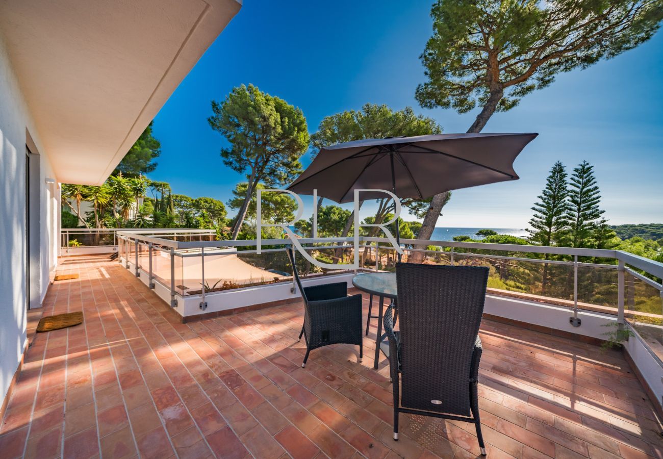 This property offers four ensuite bedrooms, three of which offer captivating sea views. It also includes a fully equipped kitchen and a spacious living and dining area with floor-to-ceiling windows that open onto an expansive terrace, featuring multiple seating areas and an infinity pool that overlooks the breathtaking sea vistas framed by tall pine trees.