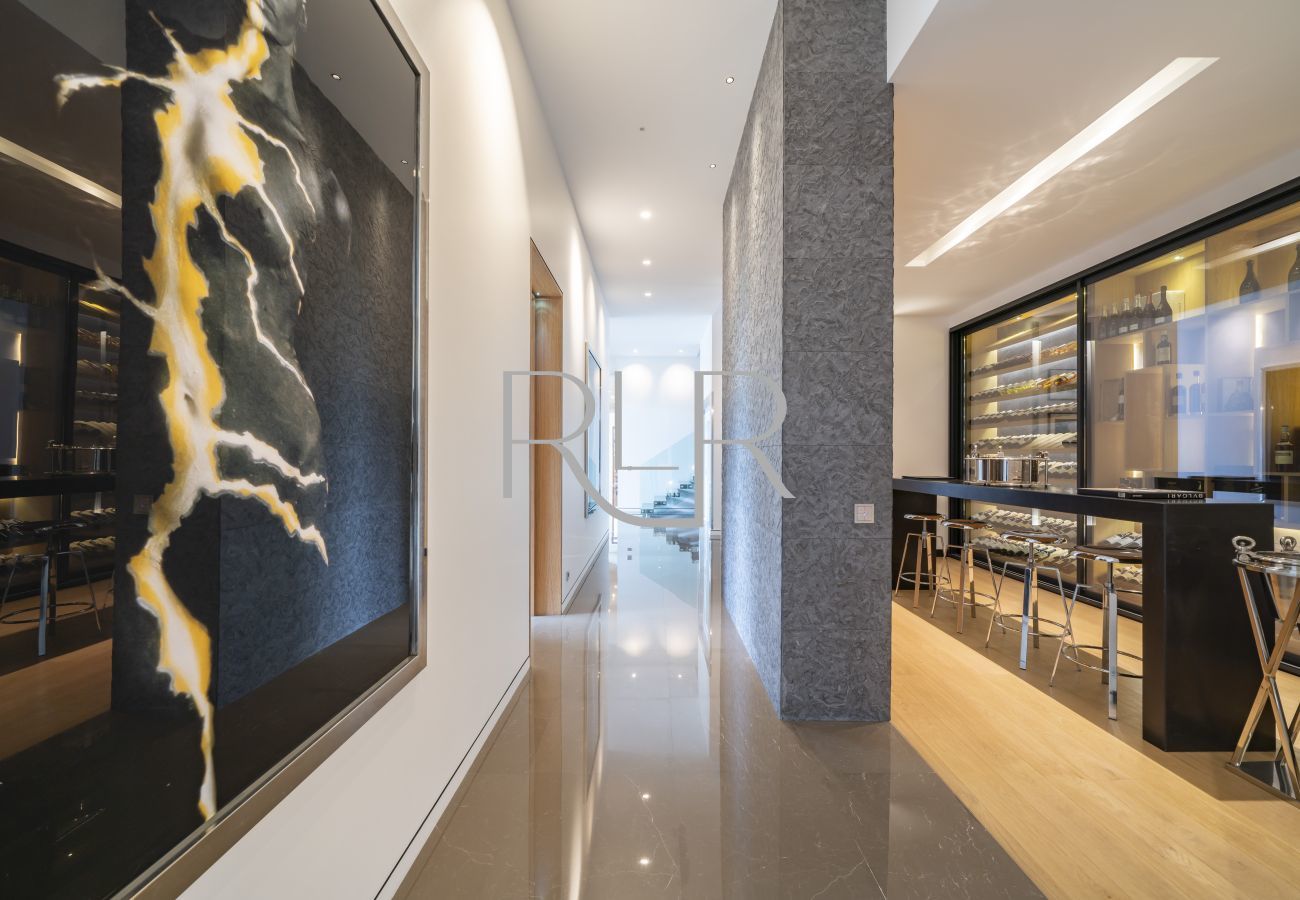 Upon arrival, guests are welcomed into an elegant entrance hall leading to a spacious reception area, complete with a TV lounge, stylish bar, and a fully equipped open-plan kitchen. A guest toilet and a private office with sea views complete this floor.