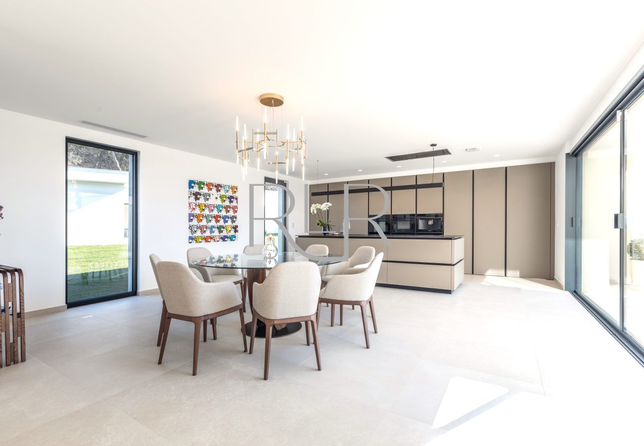 Nestled in the hills above Cannes, Villa Dahlia is a newly built architectural gem offering refined luxury and serene surroundings. With a subtle sea glimpse and breathtaking mountain views, this exceptional villa spans 550m² of living space, combining sleek modern design with top-tier comfort.