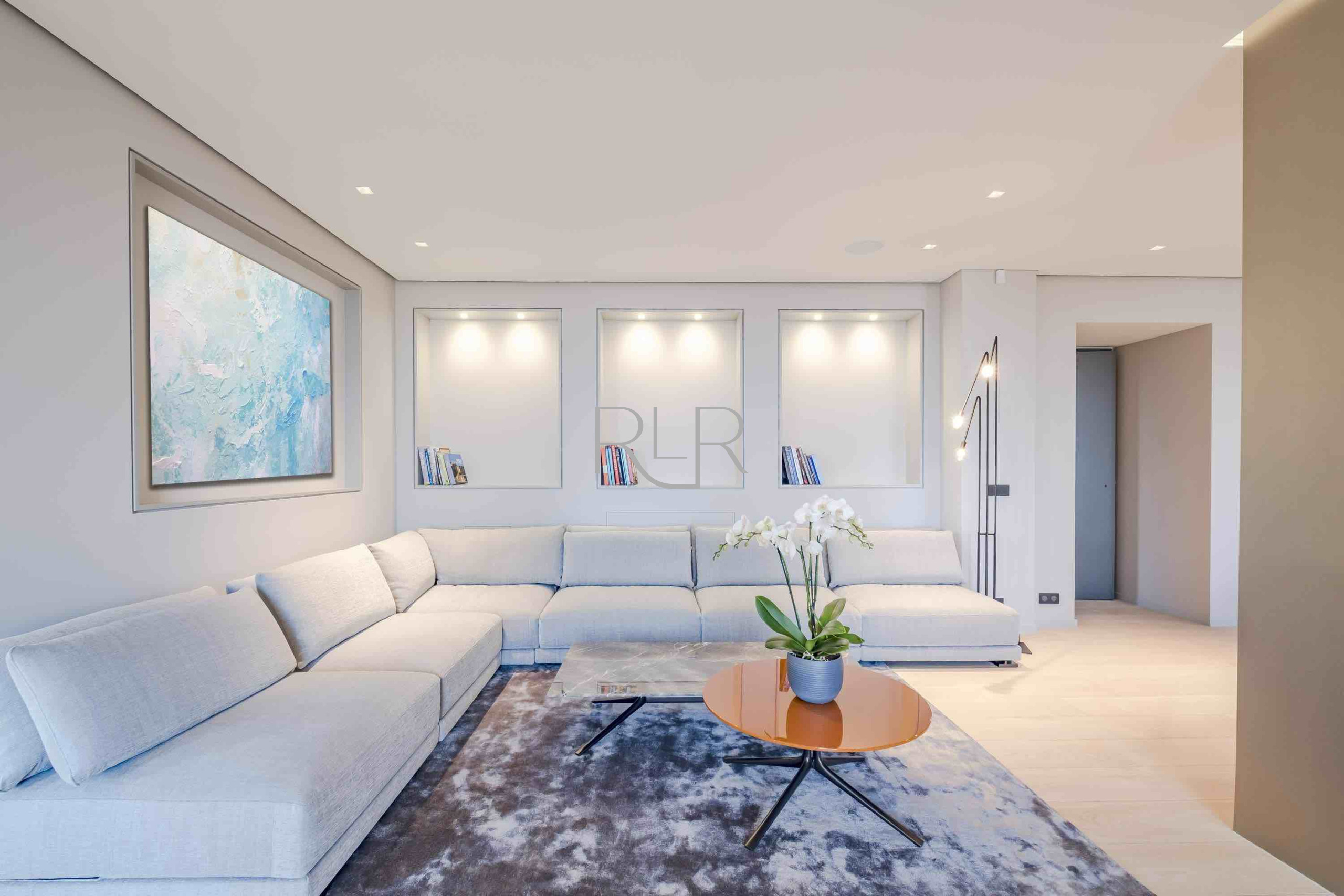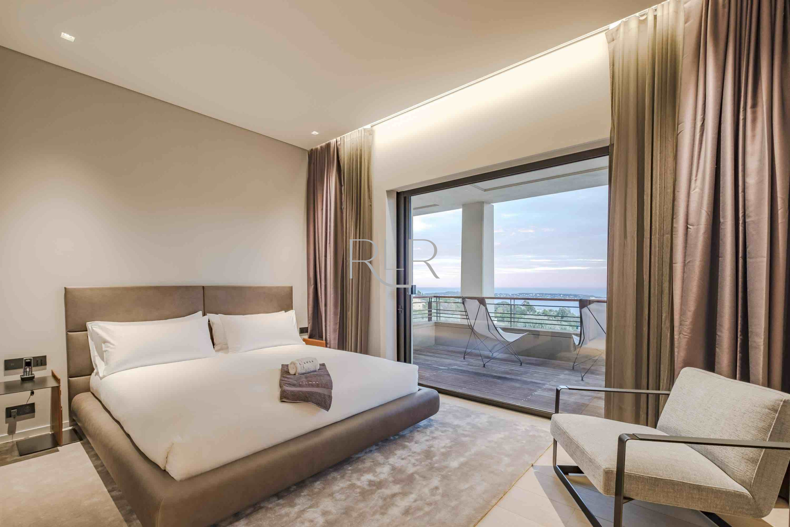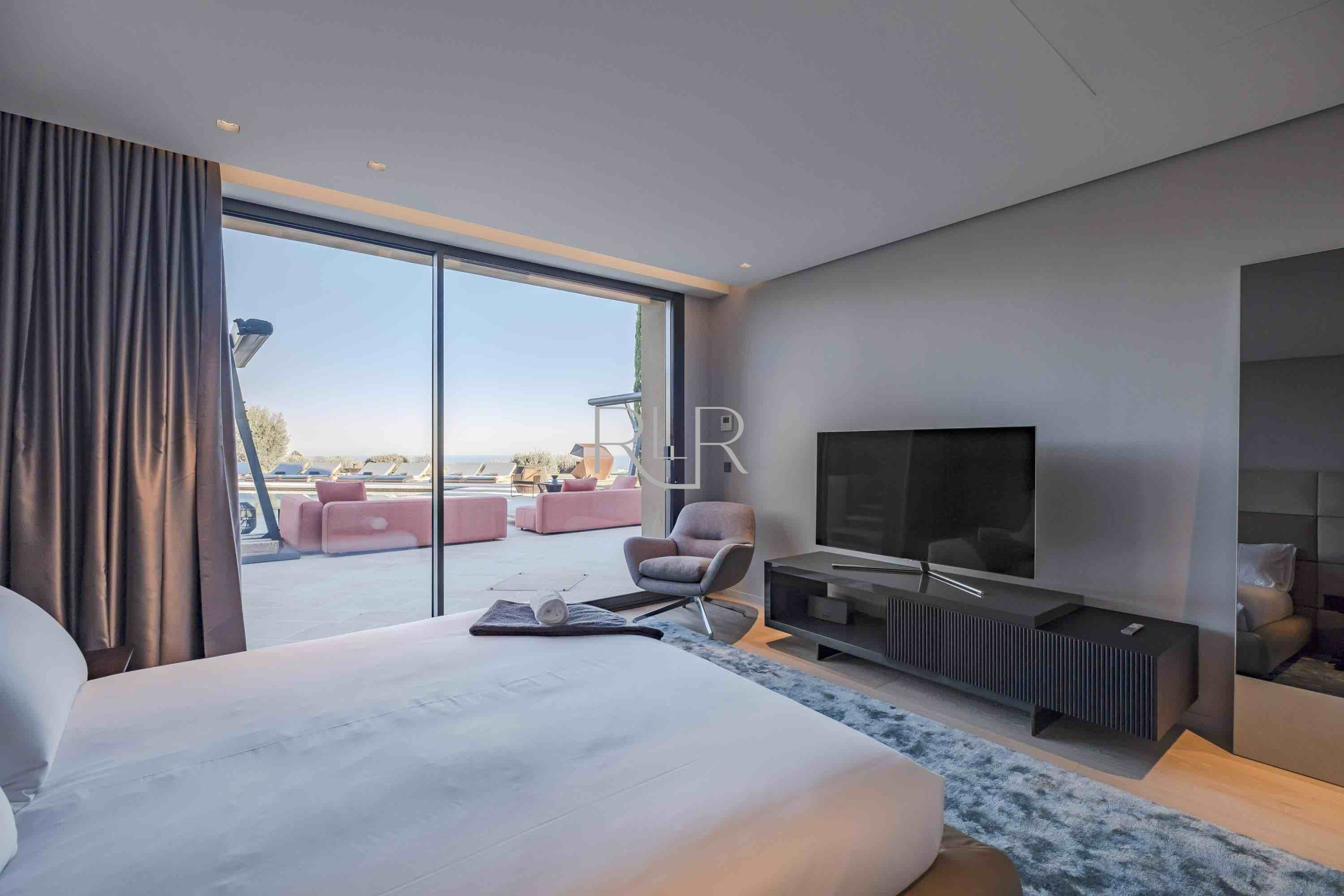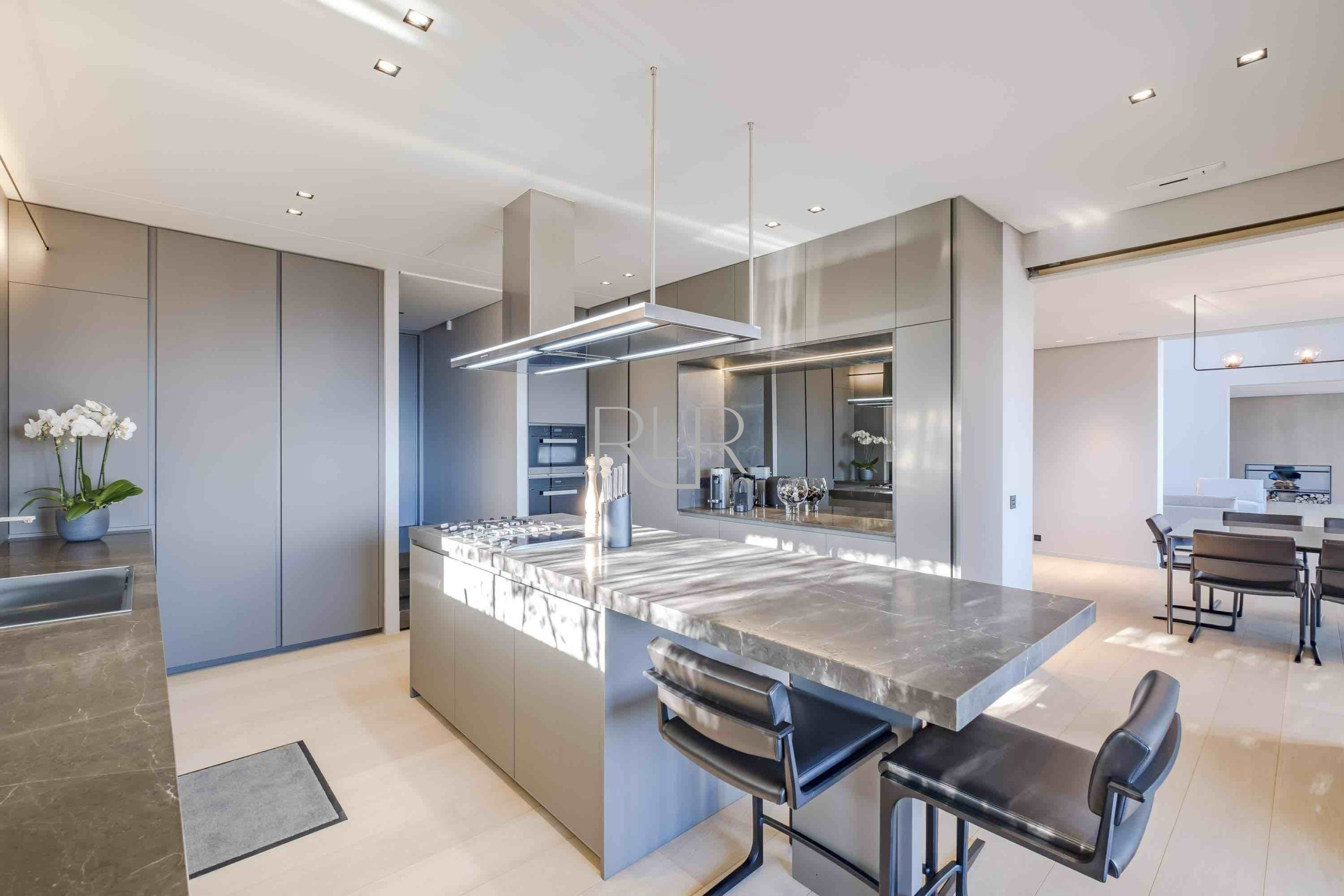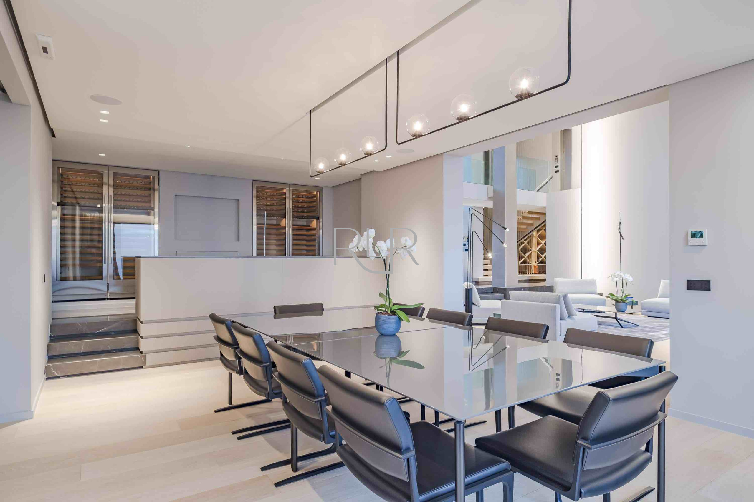 On the main level, expansive reception areas open effortlessly onto vast terraces overlooking the Mediterranean. A refined living room, elegant dining area, and fully equipped kitchen form the heart of the home — a setting designed not for display, but for living well. Here, time stretches. Mornings begin slowly, afternoons dissolve into the view, and evenings take on a rhythm of their own.