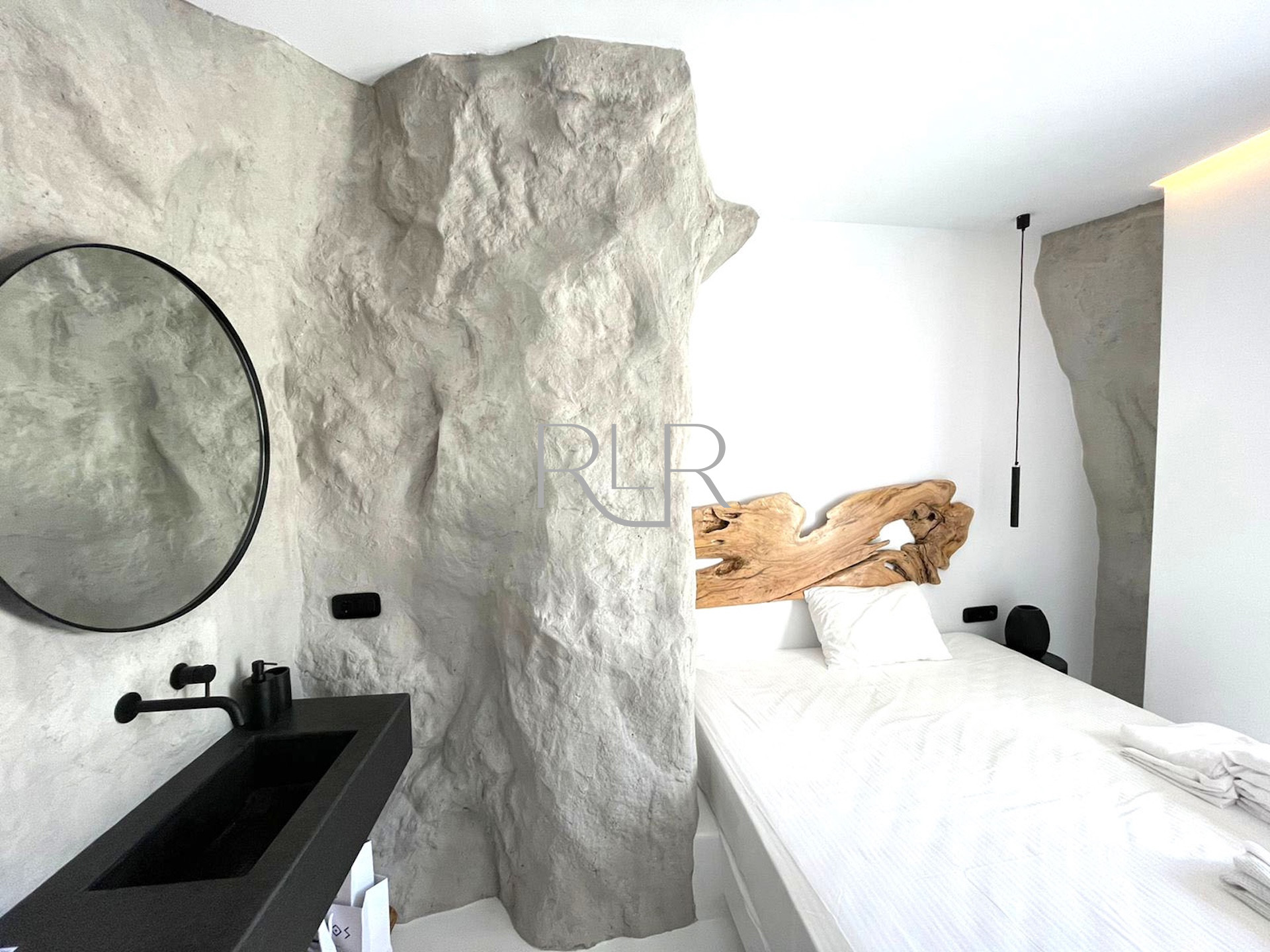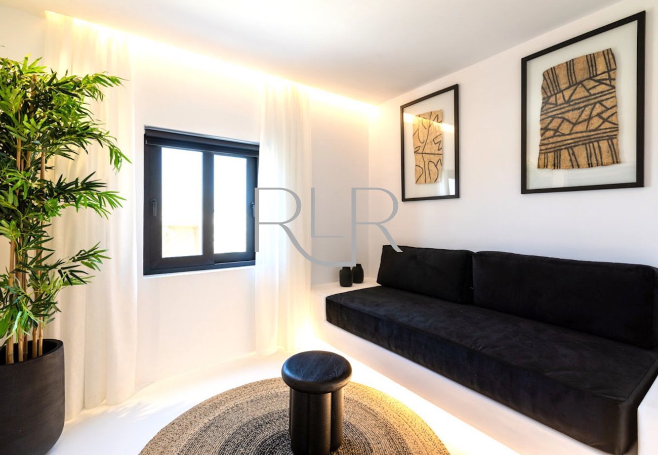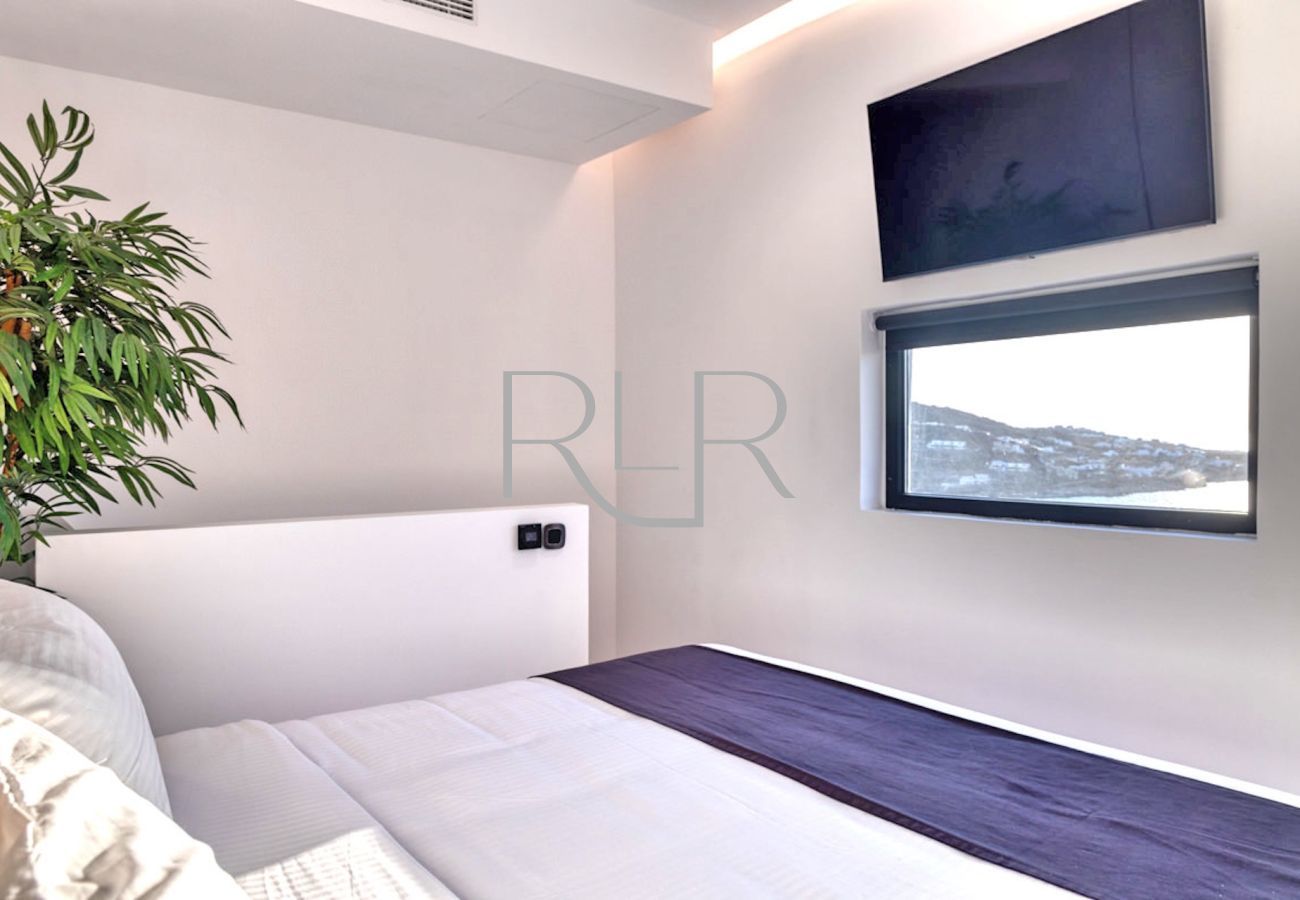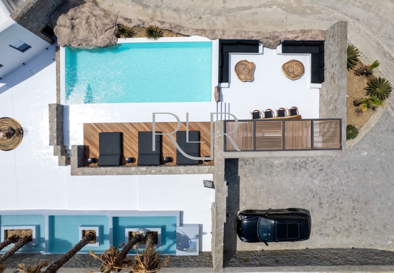 The panoramic views from the villa are absolutely breathtaking. You’ll enjoy stunning sunsets over Ornos Bay, with views extending toward the island of Delos—beloved by the ancient Greeks for its powerful energy. The endless shades of blue in the Aegean Sea provide a tranquil and inspiring backdrop.